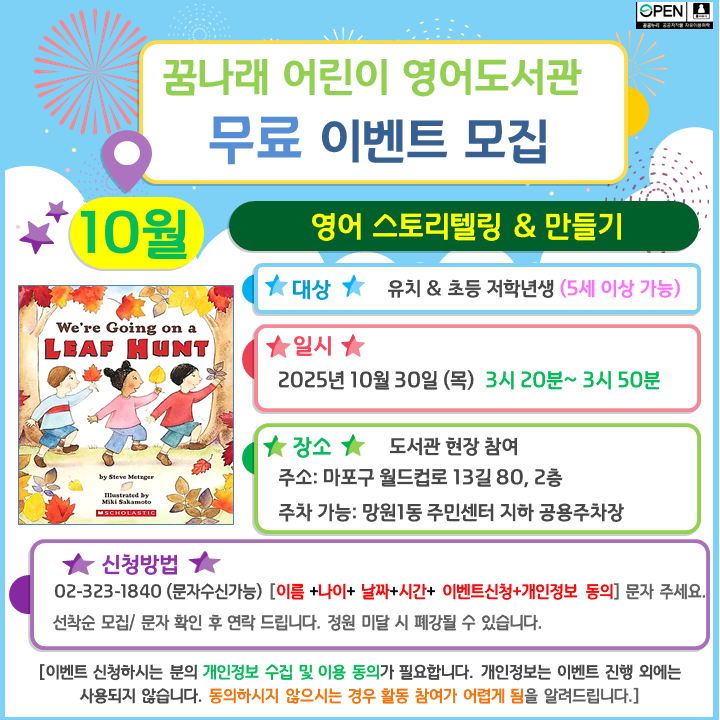 꿈나래 어린이 영어도서관 무료 이벤트(영어 스토리텔링 & 만들기) 모집 안내입니다. *대상: 5세 이상(2021년생 이상) & 초등학생 저학년 *일시 ) 2025년 10월 30일 (목) 3시20분 - 3시 50분 (30분 진행) *장소: 꿈나래어린이영어도서관 (망원동) / 마포구 월드컵로 13길 80, 2층 *신청내용(문자): "아이이름+ 나이+ 날짜 + 시간 + 이벤트 신청+개인정보 동의" 신청방법: 꿈나래 어린이영어도서관 02- 323-1840(문자수신가능)으로 문자를 보내주세요^^