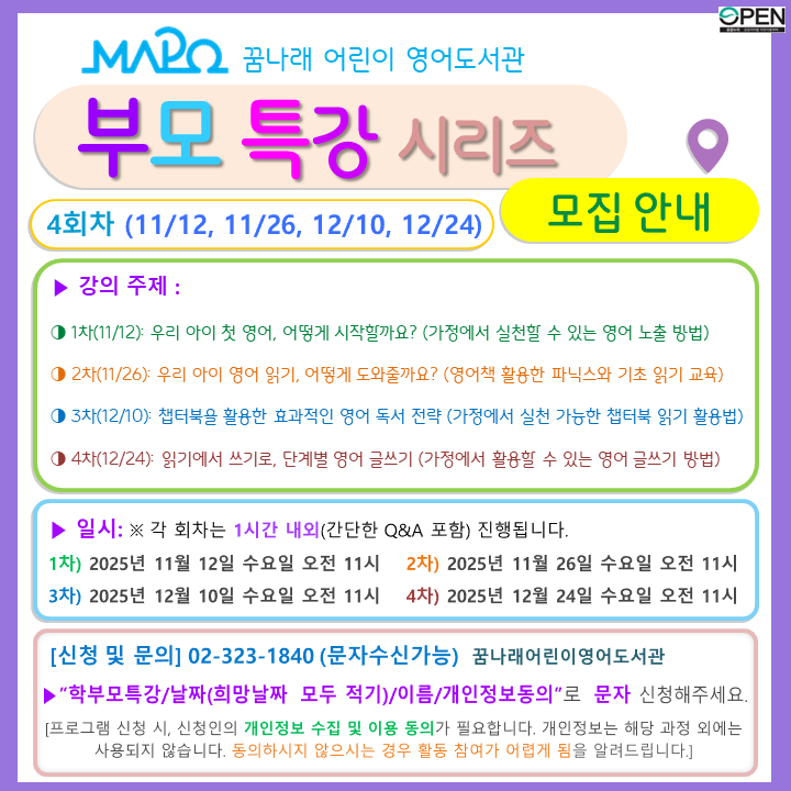 꿈나래 어린이 영어도서관 부모 특강 시리즈 모집 안내입니다.
