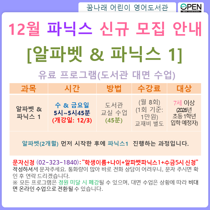 꿈나래 어린이 영어도서관 2025년 12월 알파벳 & 파닉스1 파닉스 과정 신규반 모집 안내입니다.