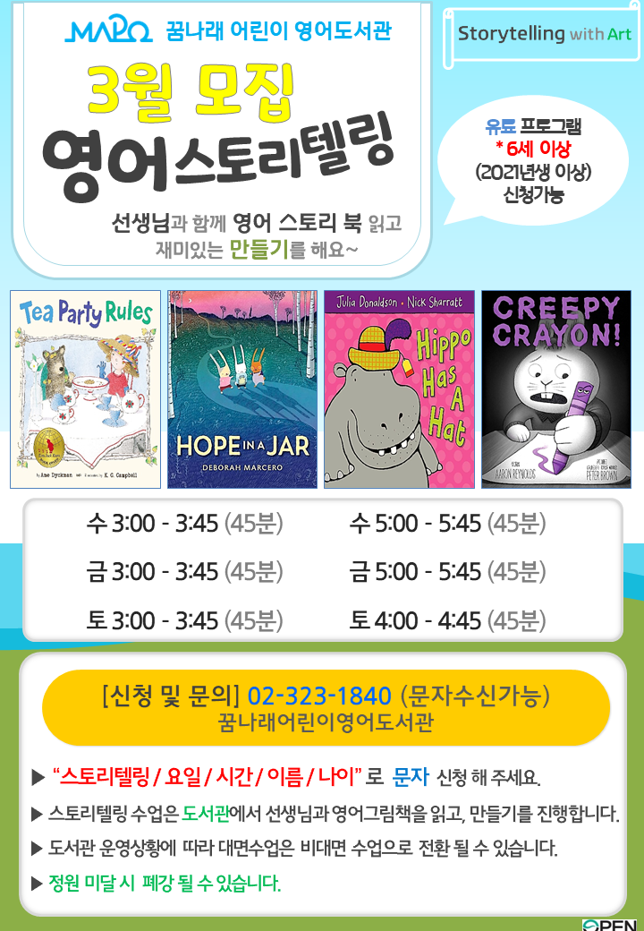꿈나래어린이영어도서관 3월 영어스토리텔링(유료프로그램) 안내입니다.