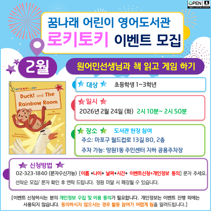 꿈나래 어린이 영어도서관 2월 로키토키 무료이벤트 모집 안내입니다.