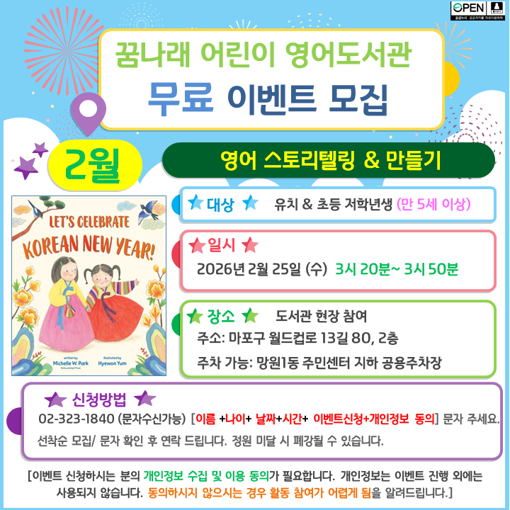 신청방법: 꿈나래 어린이영어도서관 02- 323-1840(문자수신가능)으로 문자를 보내주세요^^