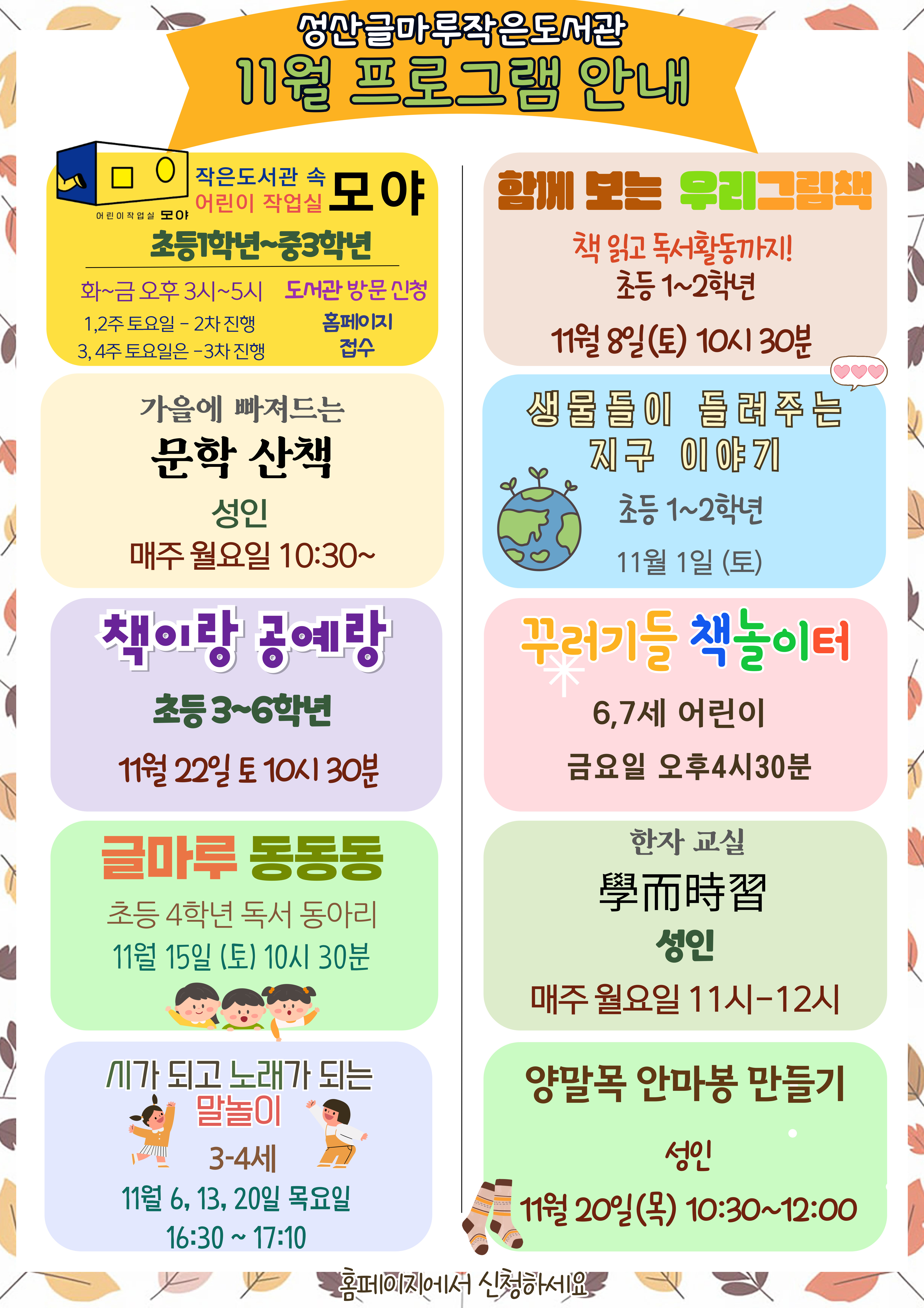 성산글마루작은도서관 11월 프로그램 안내문입니다.