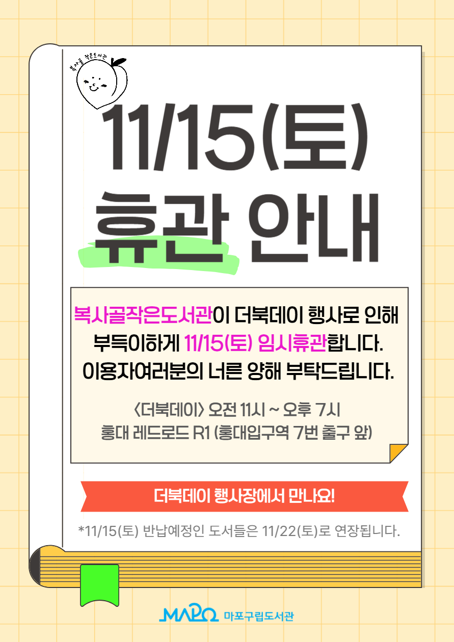 복사골작은도서관이 더북데이 행사로 인해 부득이하게 11/15(토) 임시휴관합니다. 이용자여러분의 너른 양해 부탁드립니다. * 11/15(토) 반납예정인 도서들은 11/22(토)로 연장됩니다.