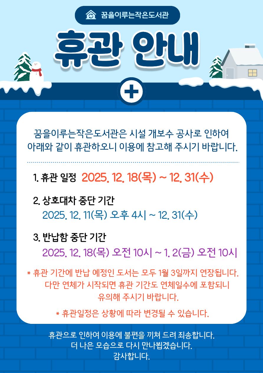 1. 휴관 일정 : 2025. 12. 18(목) ~ 12. 31(수) 2. 상호대차 중단 기간 : 2025. 12. 11(목) 오후 4시 ~ 12. 31(수) 3. 반납함 중단 기간 : 2025. 12. 18(목) 오전 10시 ~ 1. 2(금) 오전 10시