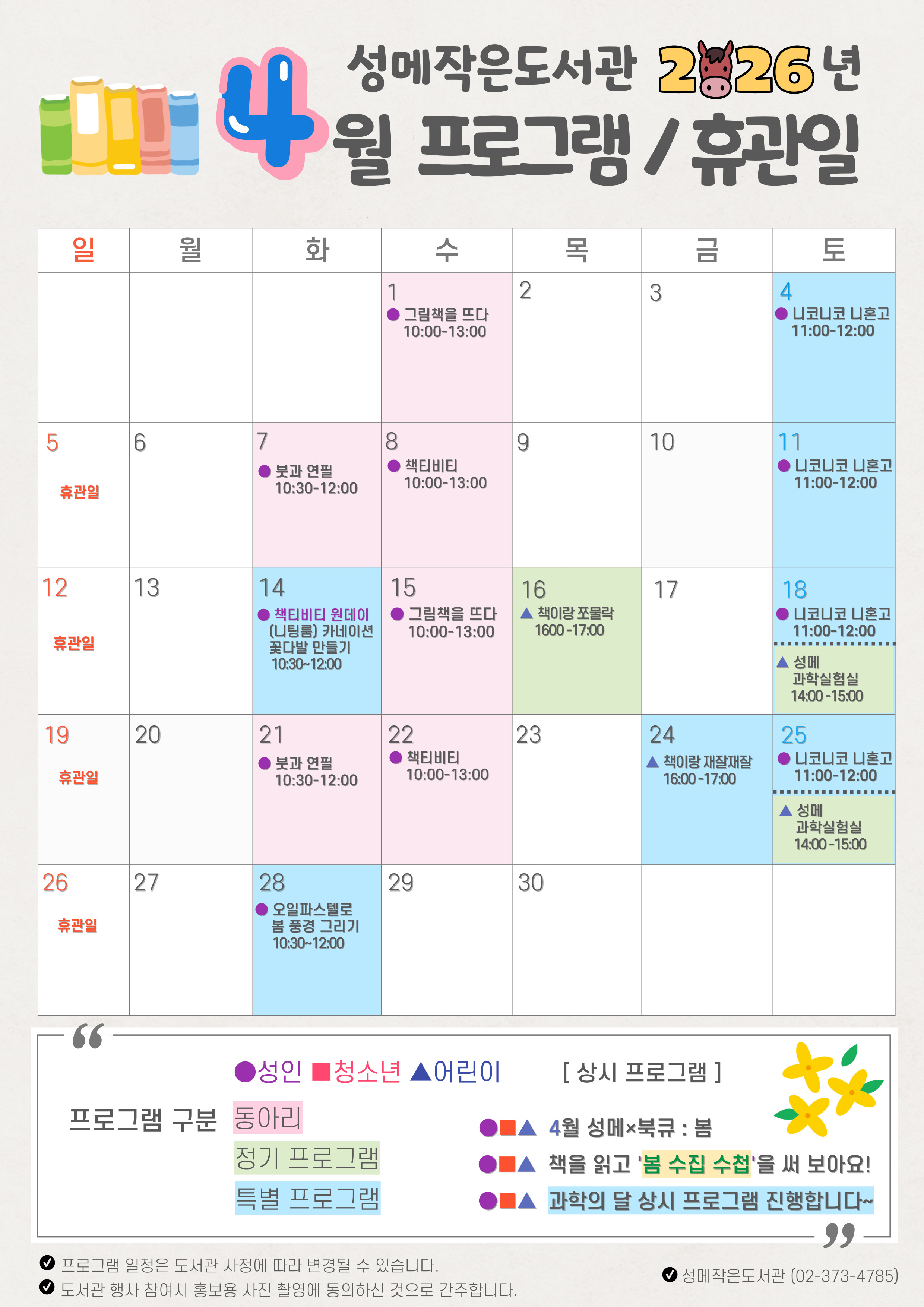 성메작은도서관 2026년 4월 프로그램 / 휴관일