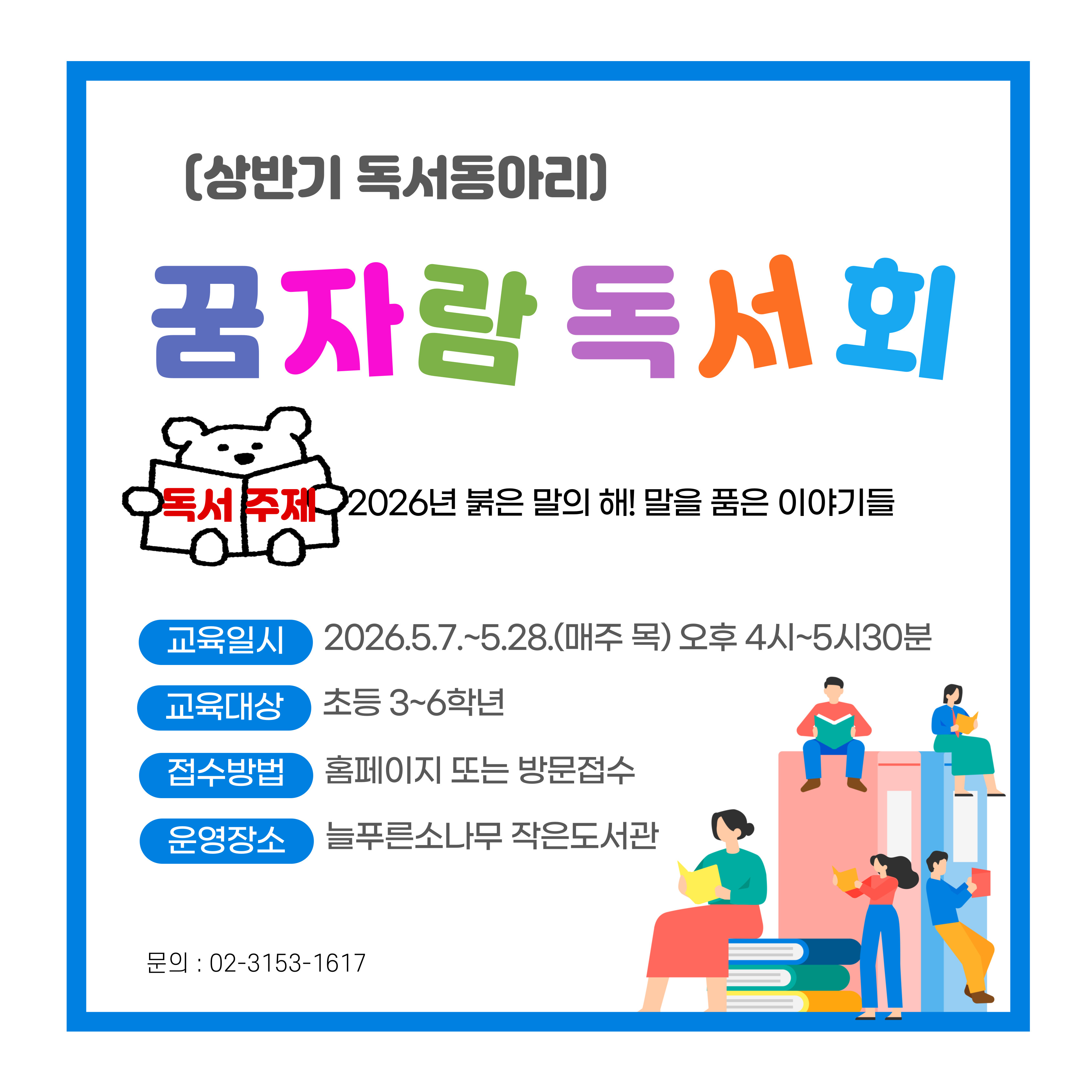 * [늘푸른](상반기 독서동아리)꿈자람 독서회 모집 안내 - 교육일시 : 26년 5월 7일 5월 28일 매주 목, 오후 4시~5시 30분 - 모집대상 : 초등 3~6학년 10명 - 운영장소 : 늘푸른소나무 작은도서관 - 지원방법 : 도서관 홈페이지 및 방문 신청 |