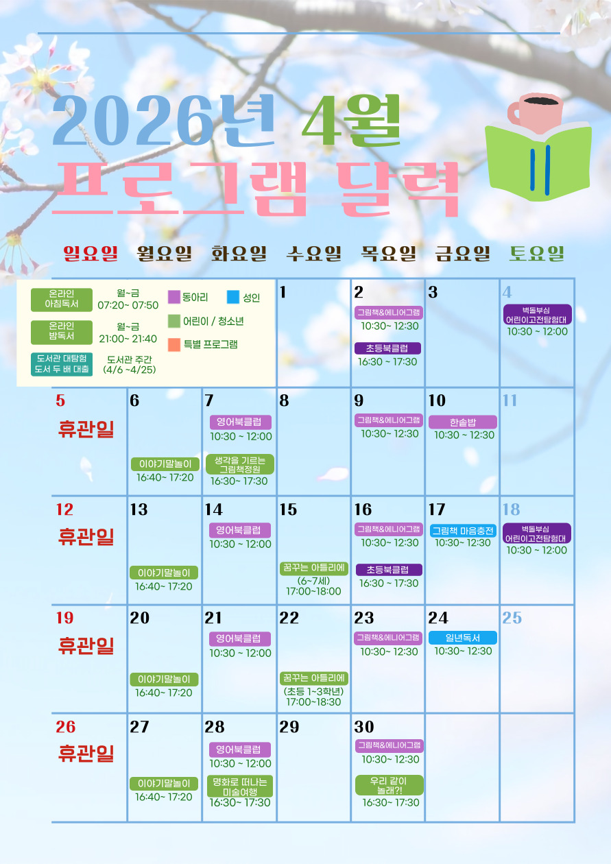 | 제목 | [꿈을] 2026년 4월 프로그램 / 휴관일 달력 |