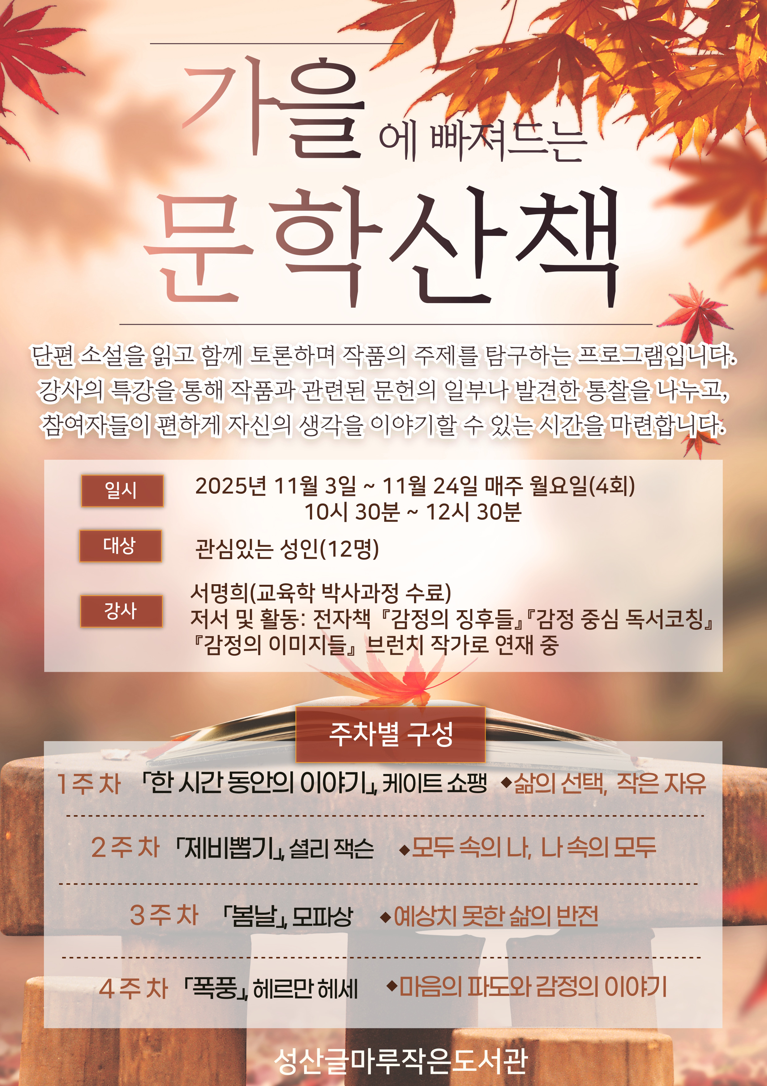 가을에 빠져드는 문학산책 단편 소설을 읽고 함께 토론하며 작품의 주제를 탐구하는 프로그램입니다. 일시: 2025년 11월 3일 ~ 11월 24일 매주 월요일(4회) 10시 30분 ~ 12시 30분 대상: 관심있는 성인 (12명) 강사: 서명희(교육학 박사과정 수료) 1주차 : 「한 시간 동안의 이야기」, 케이트 쇼팽 2주차: 「제비뽑기」, 셜리 잭슨 3주차: 「봄날」, 모파상 4주차: 「폭풍」, 헤르만 헤세 성산글마루작은도서관