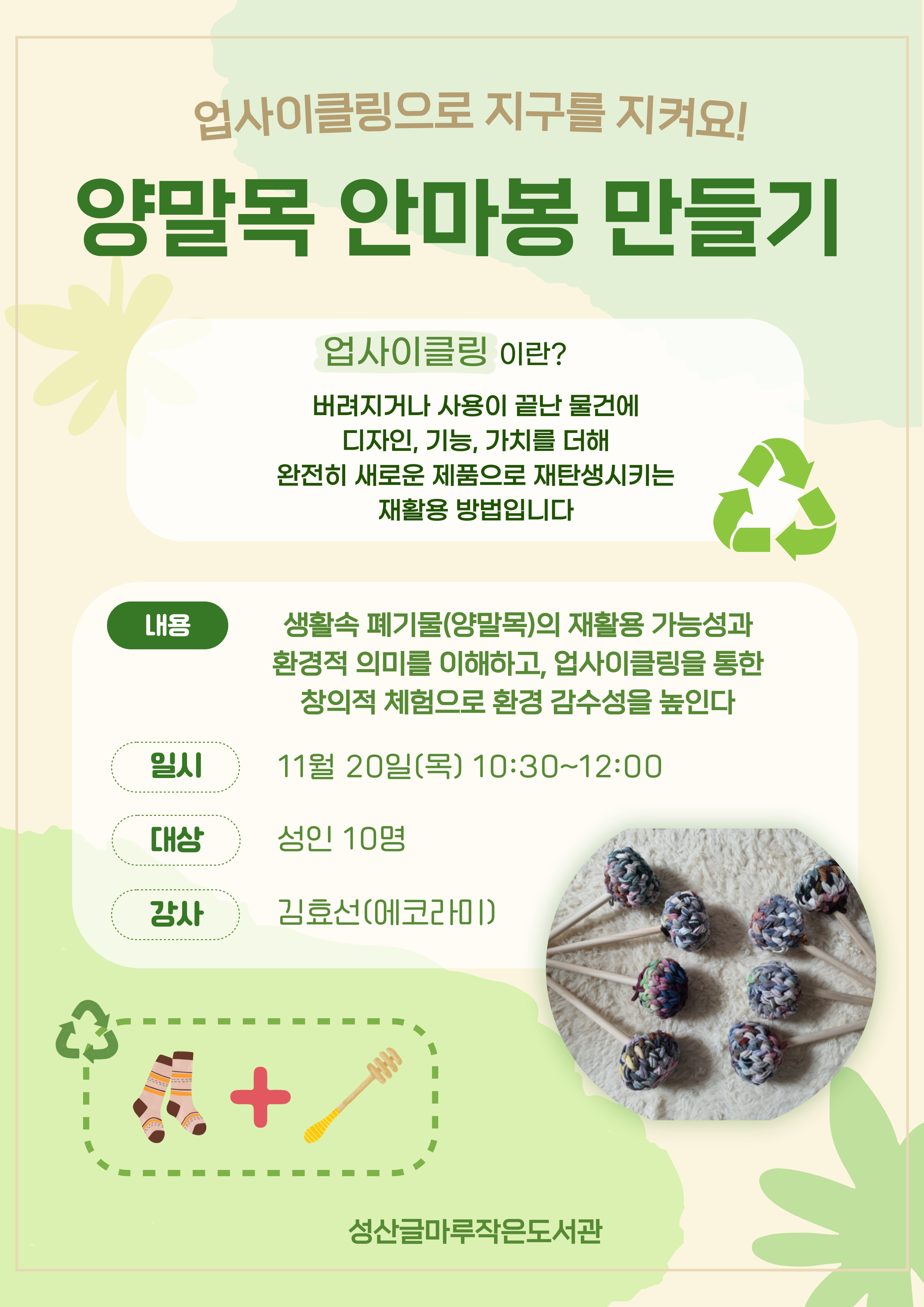 내용 : 양말목을 활용해 안마봉 만들기 일시 : 2025년 11월 20일(목) 10:30~12:00 대상 : 성인 10명 신청 : 마포구립도서관 홈페이지(전화, 방문 접수 가능) 문의 : 02-373-2900