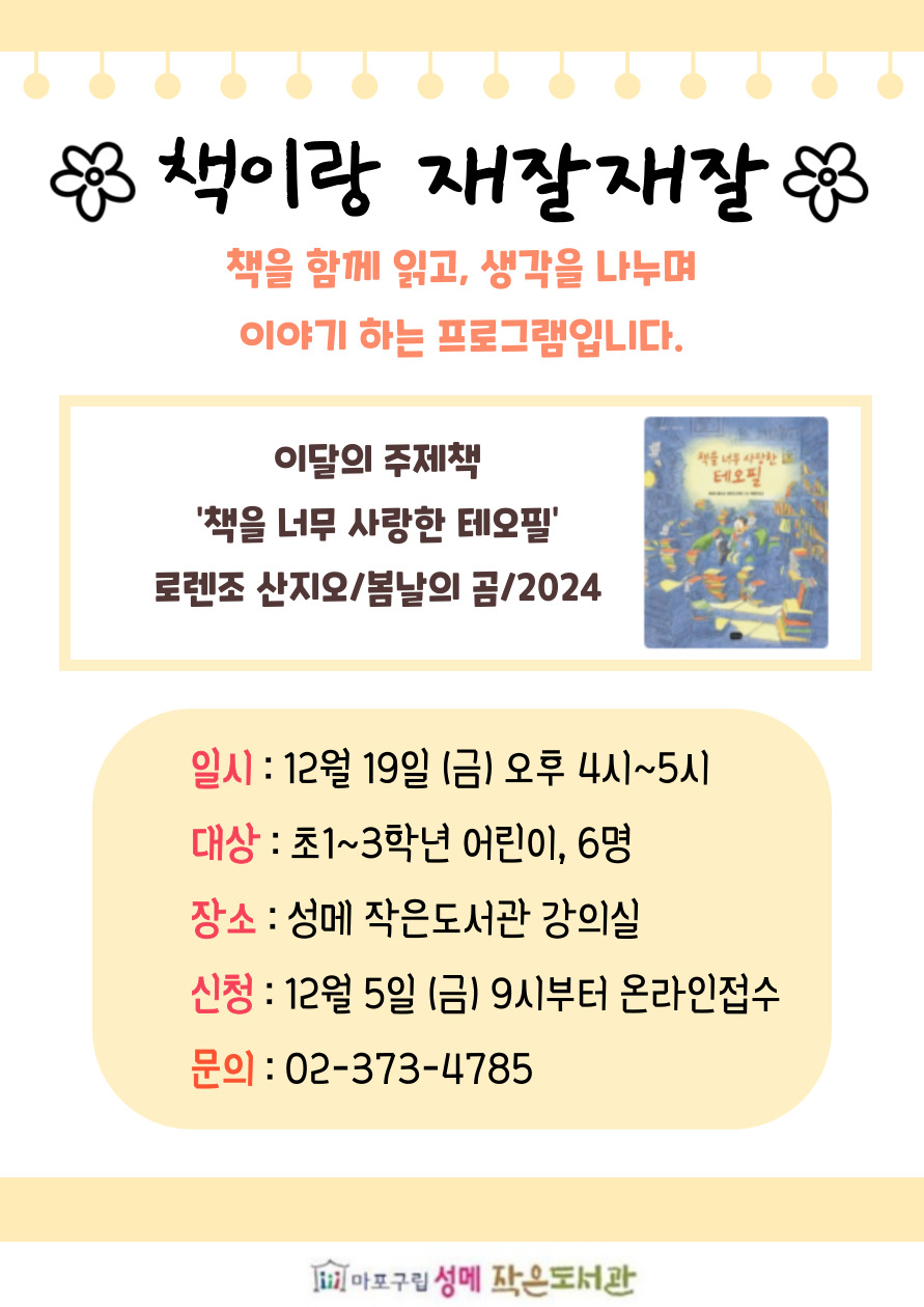 | 프로그램명 | [성메] 책이랑 재잘재잘 - 책을 너무 사랑한 테오필 접수중 | ||