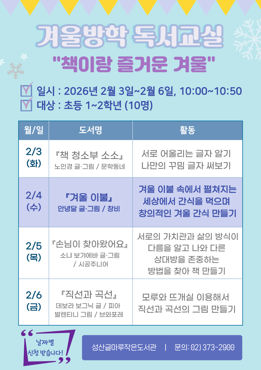 겨울방학 독서교실 “책이랑 즐거운 겨울” 일시: 2026년 2월 3일~2월 6일 10:00~10:50 대상: 초등 1~2학년 (10명)