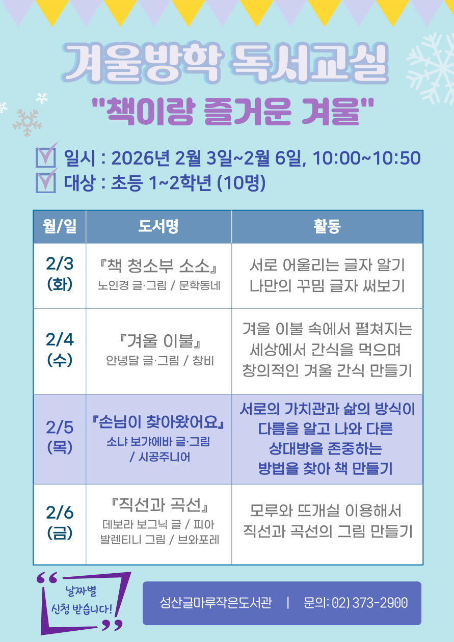 겨울방학 독서교실 “책이랑 즐거운 겨울” 일시: 2026년 2월 3일~2월 6일 10:00~10:50 대상: 초등 1~2학년 (10명)