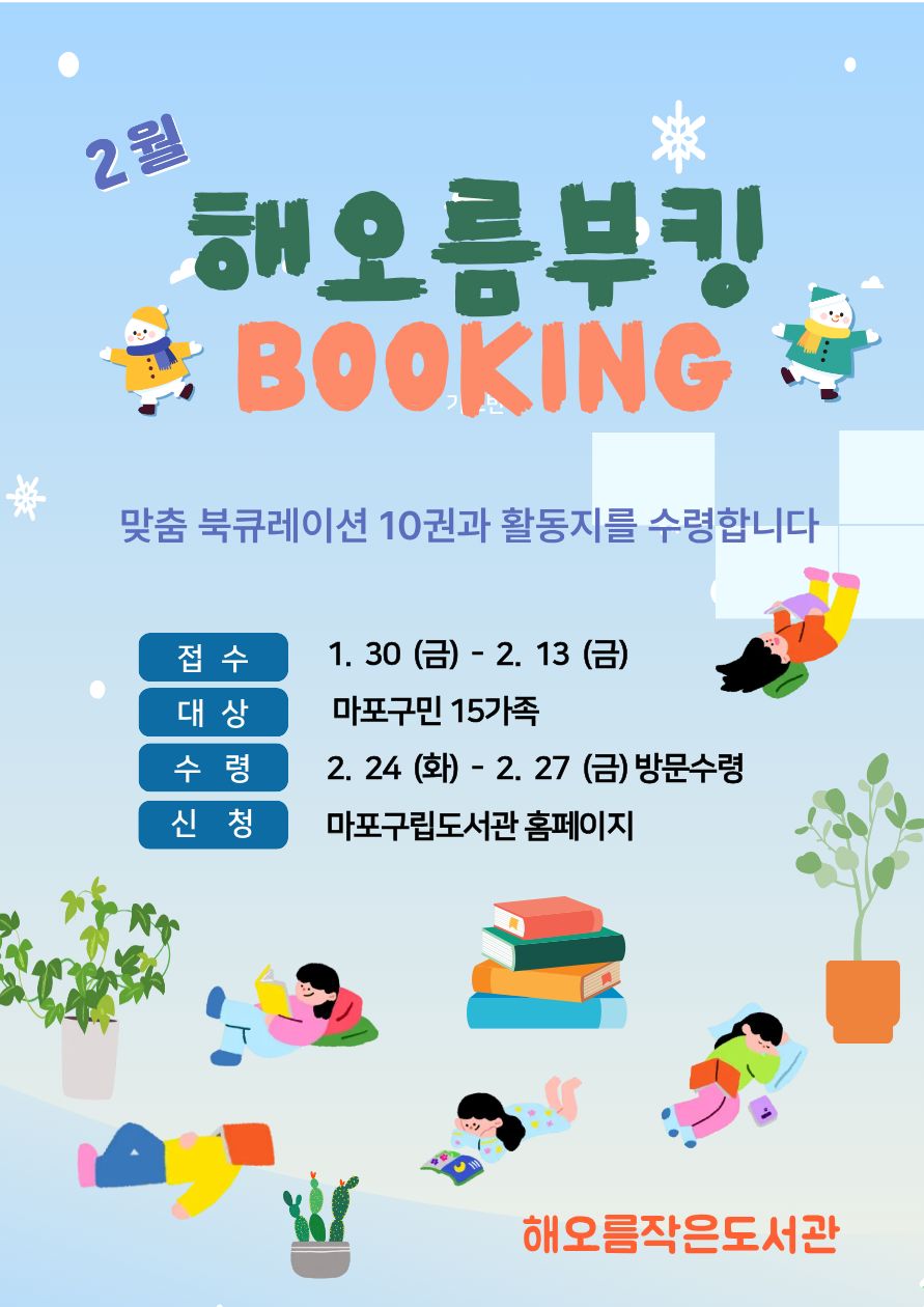해오름 부킹 맞춤 북큐레이션 10권과 활동지를 수령합니다. -접수: 1.30 (금) ~ 2.13 (금) -대상: 마포구민 15가족 -수령: 2.24 (화) ~ 2.27 (금) 방문수령 -신청: 마포구립도서관 홈페이지