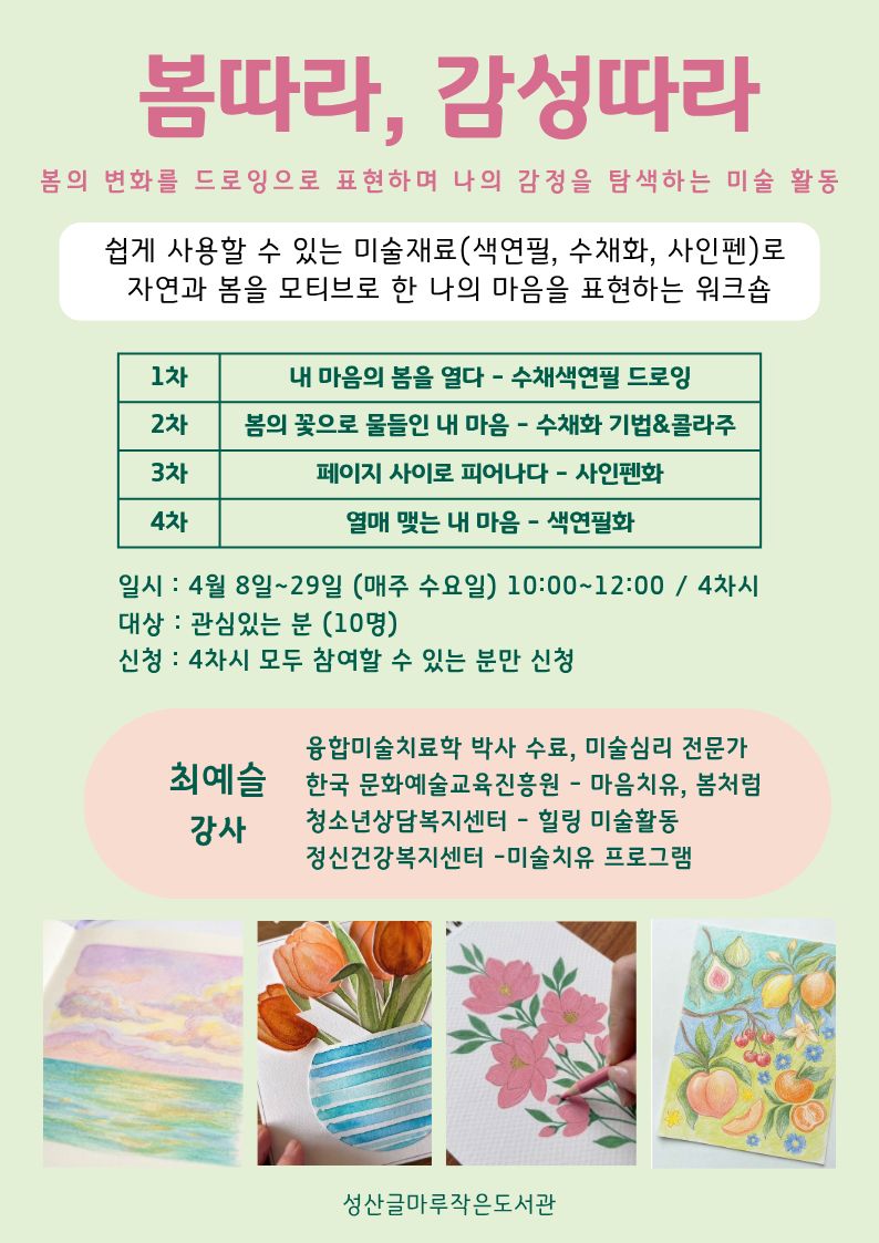 1차: 내 마음의 봄을 열다 - 수채색연필 드로잉 2차: 봄의 꽃으로 물들인 내 마음 - 수채화 기법&콜라주 3차 : 페이지 사이로 피어나다 - 사인펜화 4차 : 열매 맺는 내 마음 - 색연필화