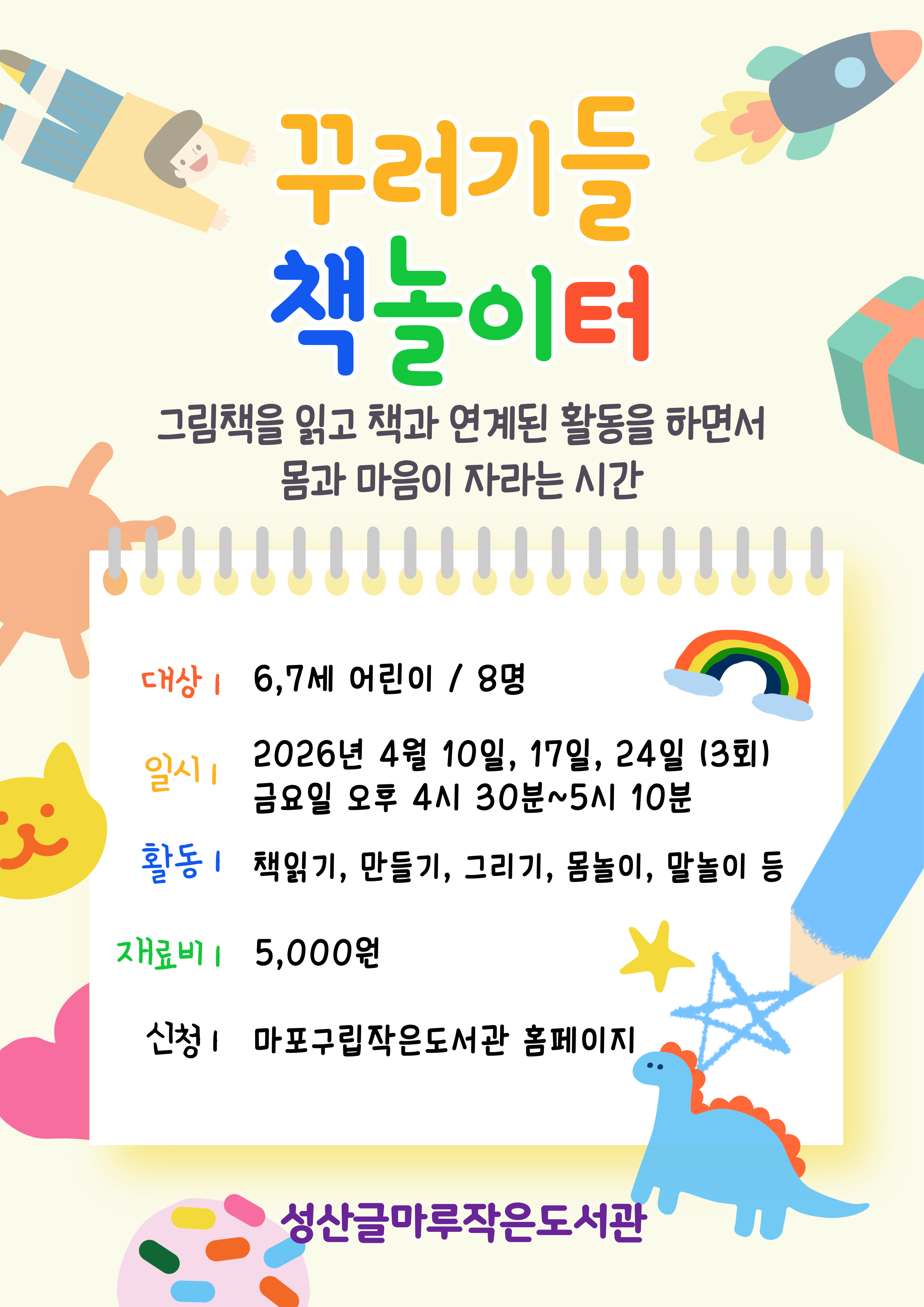 꾸러기들 책놀이터 그림책을 읽고 책과 연계된 활동을 하면서 대상 : 6, 7세 어린이 일시: 2026년 4월 10일, 17일, 24일. 매주 금요일 16:30~17:10 (3회차) 활동: 책읽기, 만들기, 그리기, 몸놀이, 말놀이...... 재료비: 5,000원 신청: 마포구립작은도서관 홈페이지