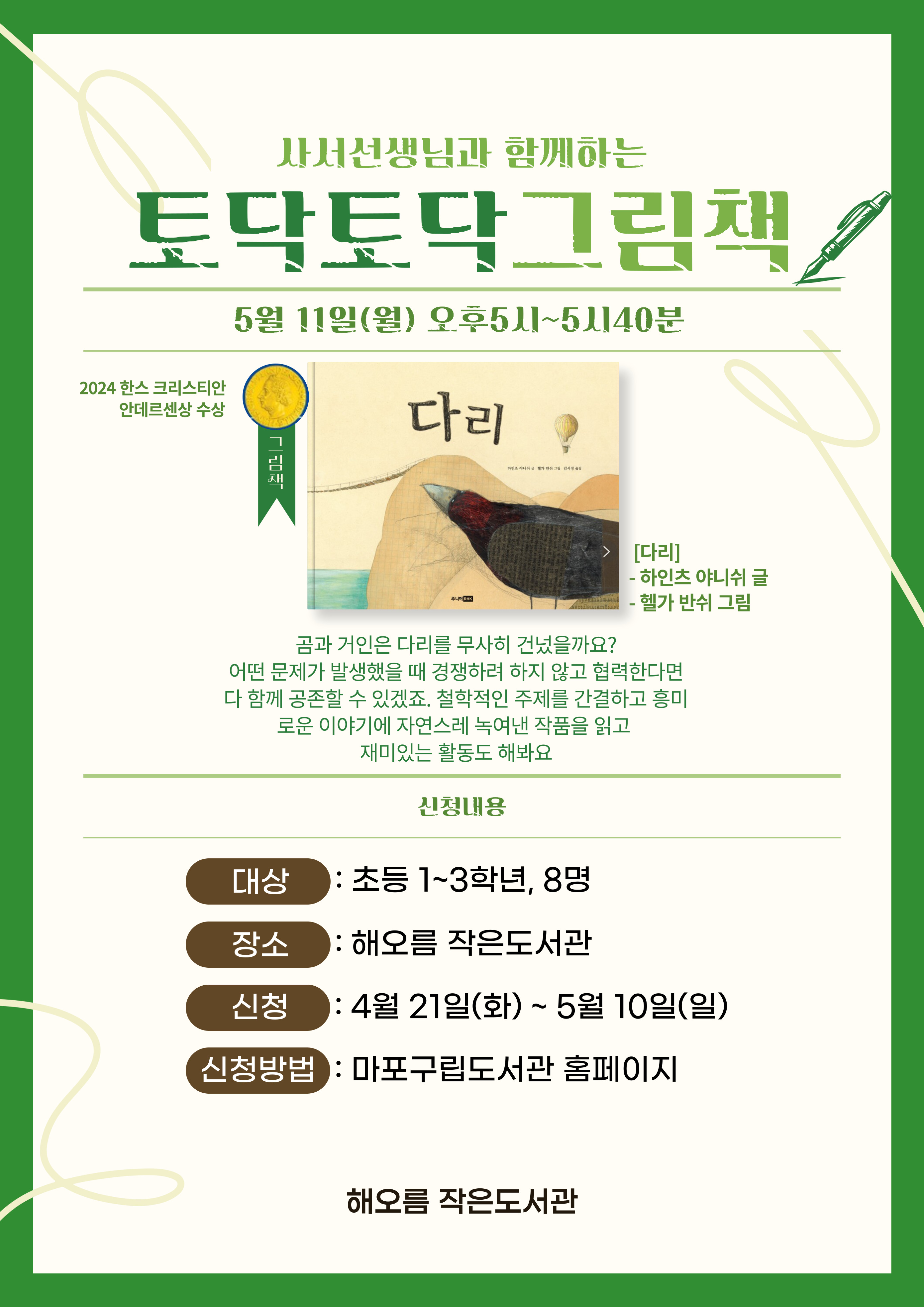 그림책 <다리> 하인츠 야니쉬 글 곰과 거인은 다리를 무사히 건넜을까요? 철학적인 주제를 간결하고 흥미로운 이야기에 자연스레 녹여낸 작품을 읽고 재미있는 활동도 해봐요. - 대상 : 초등 1~3학년 , 8명 - 일시 : 5월 11일(월) 오후 5시 ~ 5시 40분 - 장소 : 해오름 작은도서관 - 신청방법 : 마포구립도서관 홈페이지