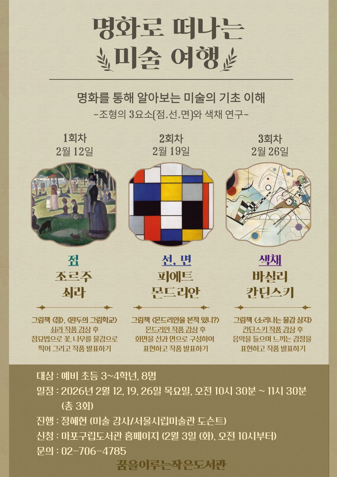 대상 예비 초등 3~4학년, 8명 일시 2026년 2월 12, 19, 26일 목요일, 오전 10시 30분 ~ 11시 30분 장소 정혜현 (미술 강사/서울시립미술관 도슨트) 장소 꿈을이루는작은도서관 프로그램실 신청 마포구립도서관 홈페이지 (2월 3일 (화), 오전 10시부터 신청 문의 02-706-4785