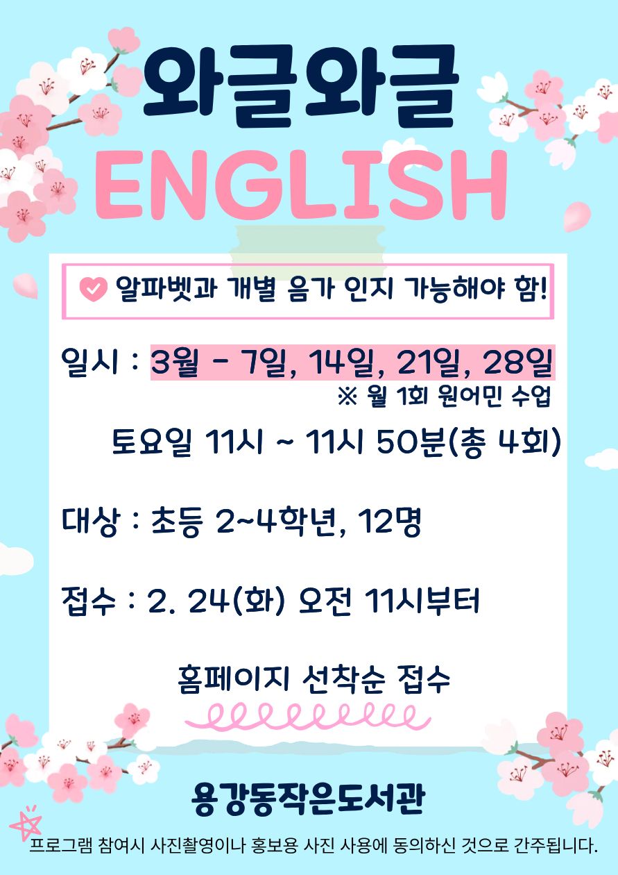 와글와글 English * 알파벳과 개별 음가 인지 가능해야 함!!! * 일 시 : 3/7, 3/14, 3/21, 3/28 (매주 토요일) * 대 상 : 초등 2~4학년, 12명 * 접 수 : 2. 24(화) 오전 11시부터 홈페이지 선착순 접수