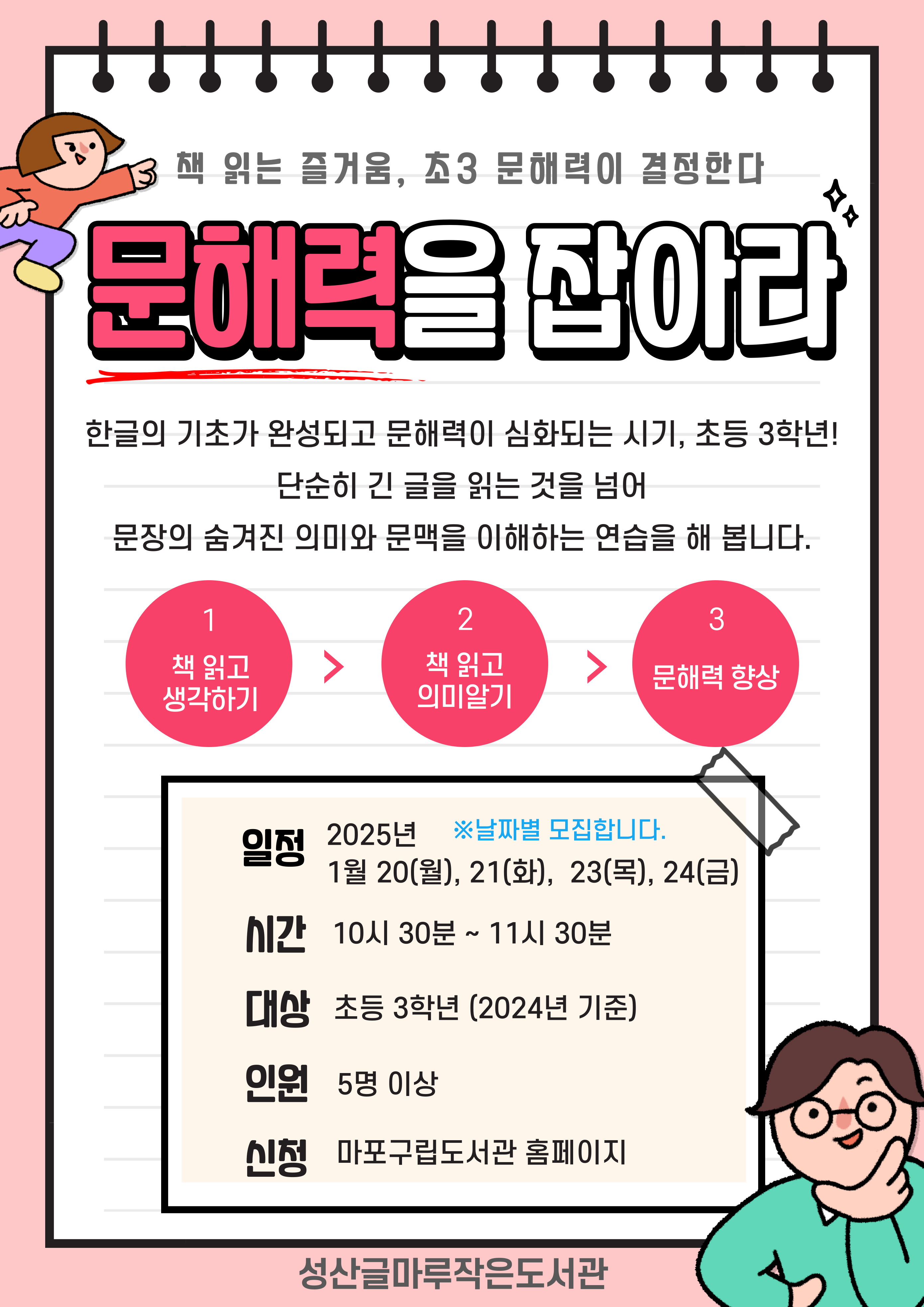 문해력을 잡아라! 책 읽는 즐거움, 초3 문해력이 결정한다! 한글의 기초가 완성되고 문해력이 심화되는 시기, 초등 3학년! 단순히 긴 글을 읽는 것을 넘어 문장의 숨겨진 의미와 문맥을 이해하는 연습을 해 봅니다. 책 읽고 생각하기 -> 책 읽고 의미알기 -> 문해력 향상 일정 : 2025년 1월 20(월), 21(화), 23(목), 24(금) 시간: 10시 30분~11시 30분 대상 : 초등 3학년(2024년 기준) 신청: 마포구립작은도서관 홈페이지 성산글마루 작은도서관 |