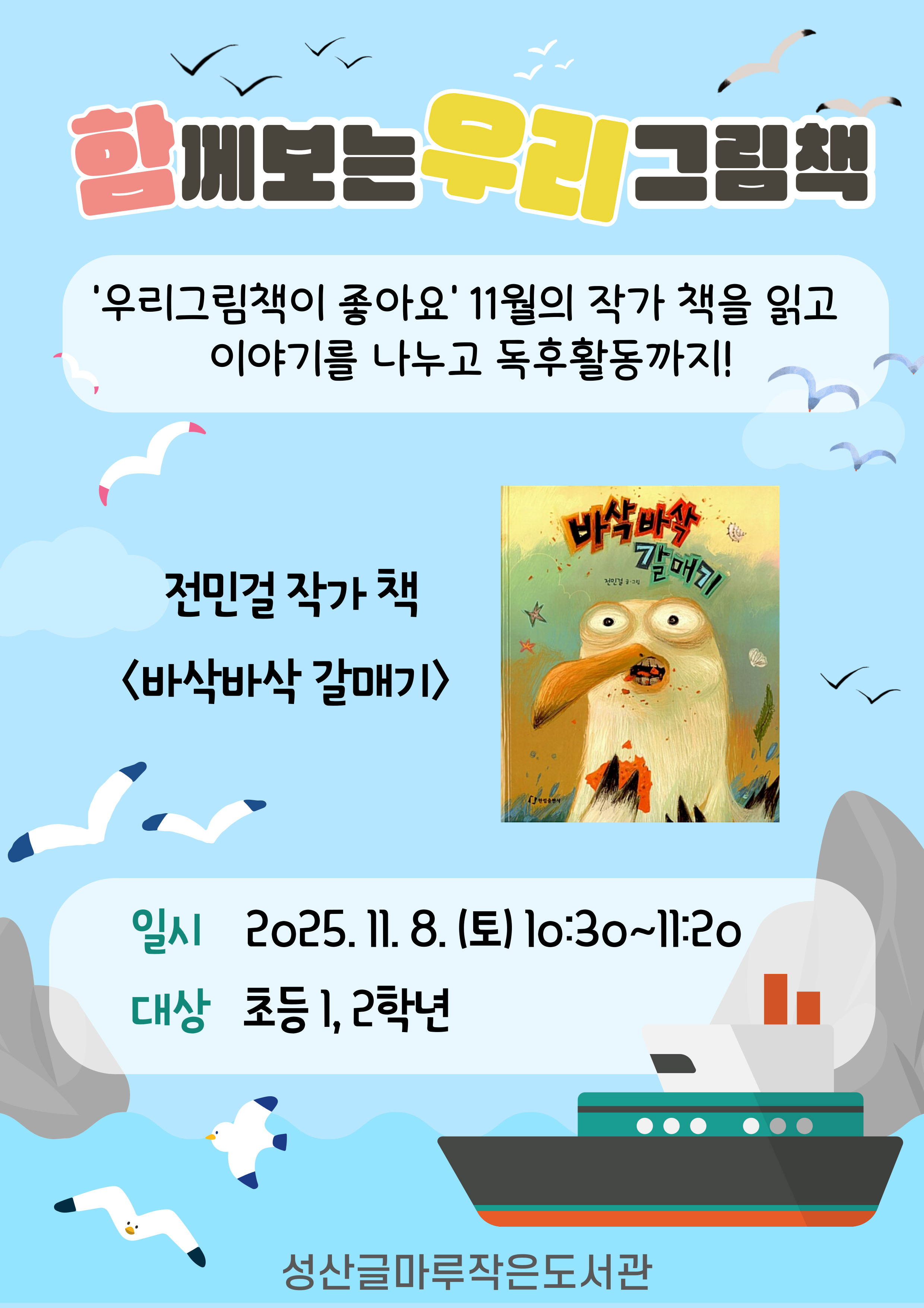 전민걸 작가 <바삭바삭 갈매기> 대상: 초등 1,2학년 일시: 11월 8일(토) 10:30~11:20 신청: 마포구립작은도서관 홈페이지