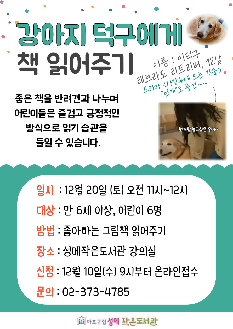 | 프로그램명 | [성메] 도서관 강아지 덕구에게 책 읽어주기 (오전) 마감 | ||