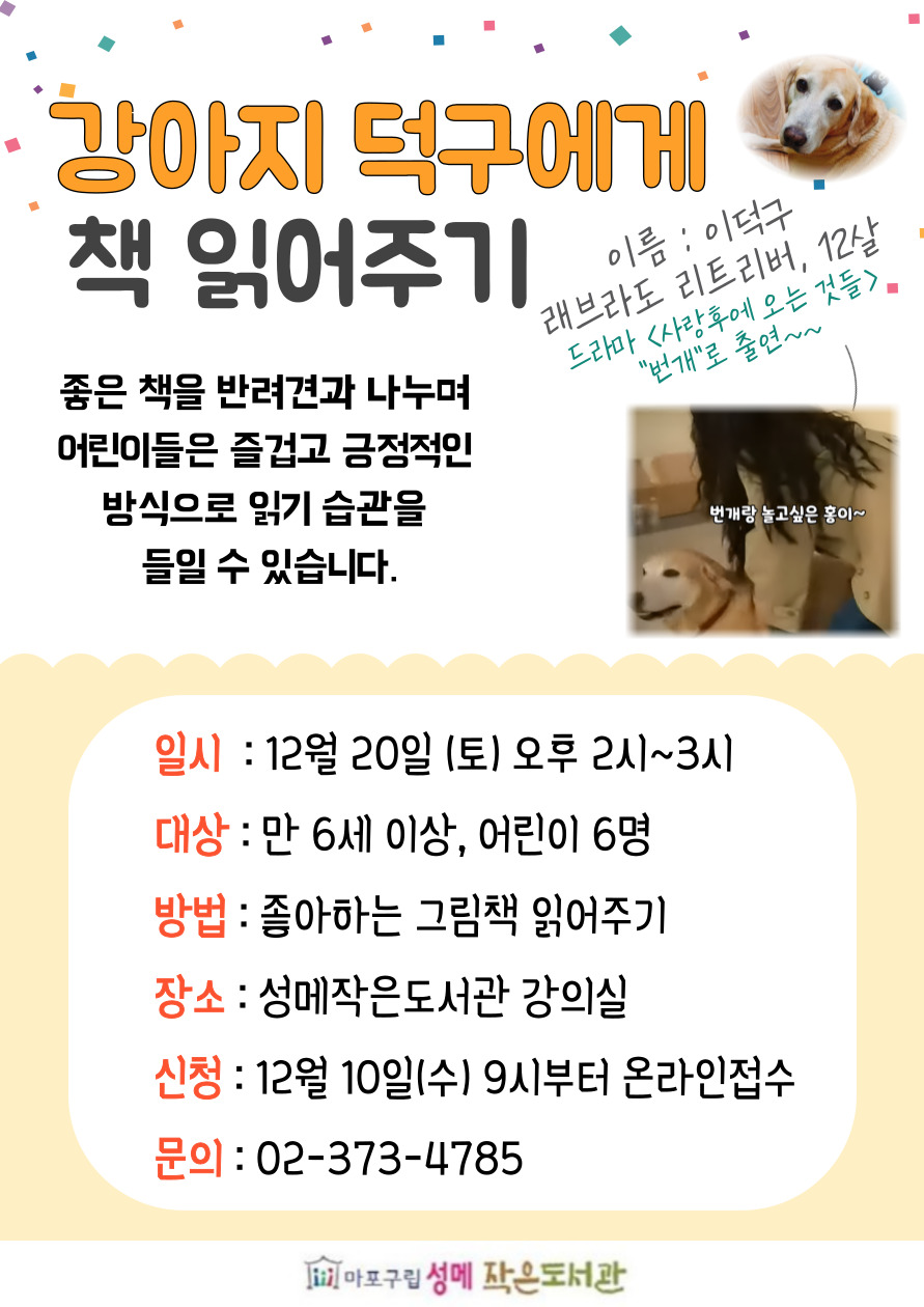 | 프로그램명 | [성메] 도서관 강아지 덕구에게 책 읽어주기 (오후) 마감 | ||