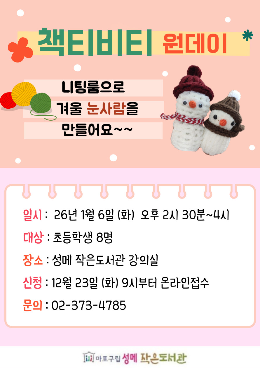| 프로그램명 | [성메] (초등) 책티비티 원데이 - 니팅룸으로 겨울 눈사람 만들기 대기자접수중 | ||