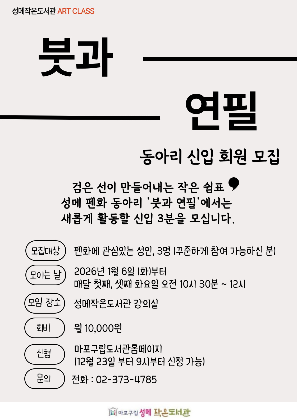 모집대상 : 펜화에 관심있는 성인, 3명 (꾸준하게 참여 가능하신 분) 모이는날 : 2026년 1월 6일(화) 부터 매달 첫째, 셋째 화요일 오전 10시 30분 ~ 12시 모임장소 : 성메작은도서관 강의실 회 비 : 월 10,000원 신 청 : 마포구립도서관홈페이지 (12월 23일 부터 9시부터 신청 가능) 문 의 : 전화 : 02-373-4785
