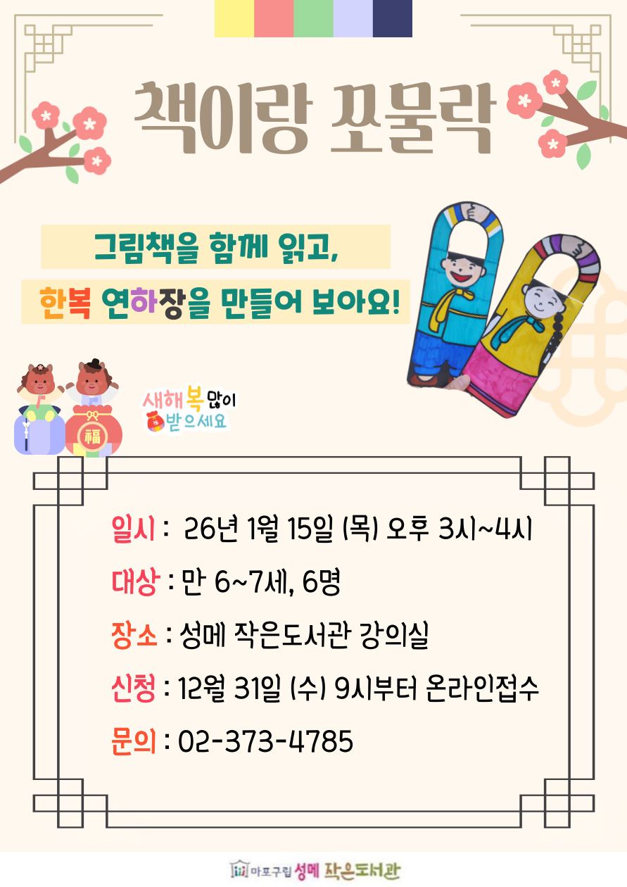 | 프로그램명 | [성메] 책이랑 쪼물락 : 한복 연하장 만들기 예정 | ||