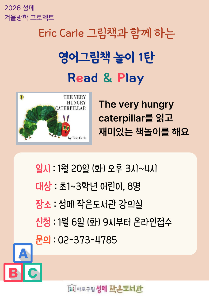 | 프로그램명 | [성메] (방학특집) 영어그림책 놀이 1탄 - Read & Play 마감 | ||