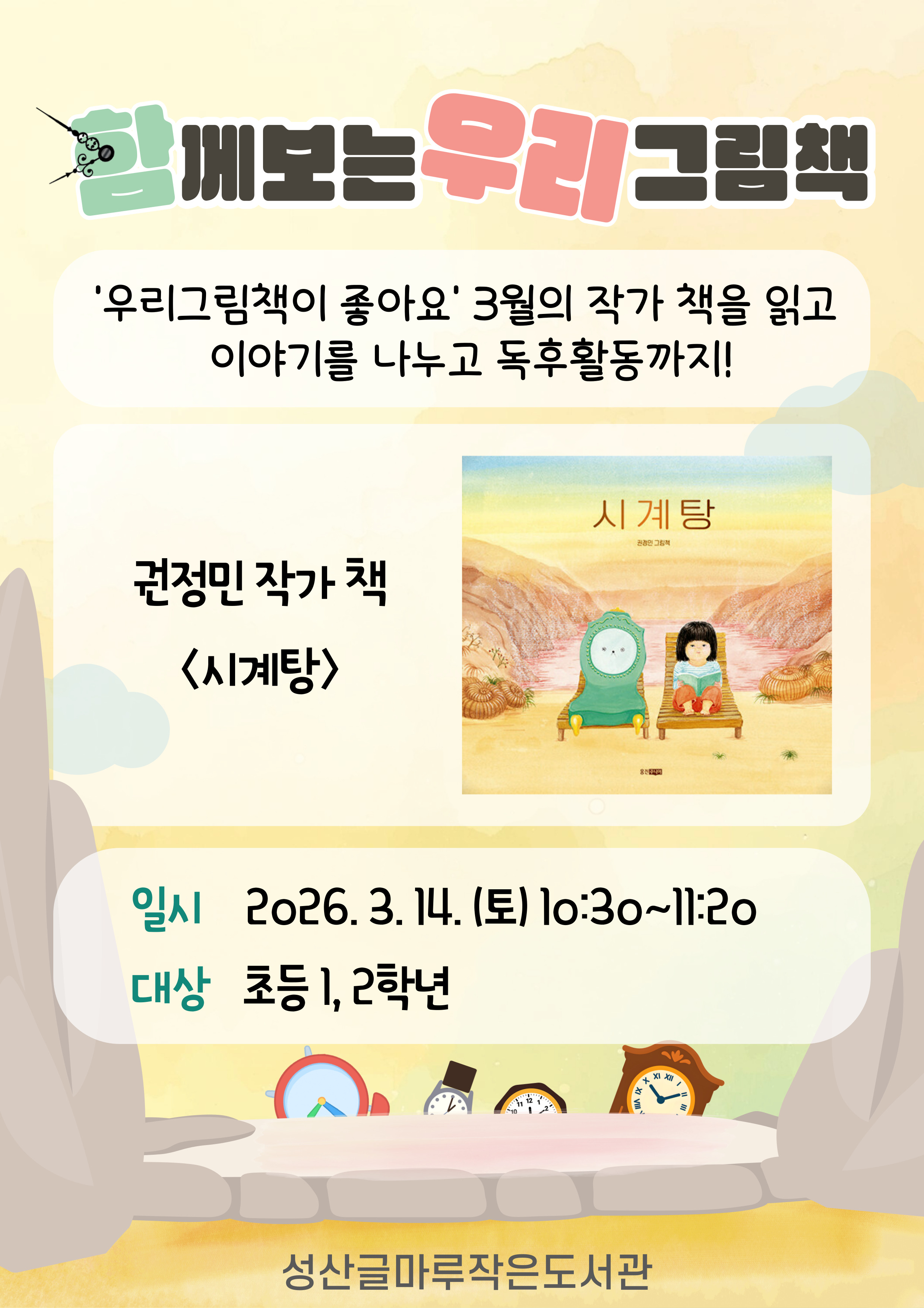 함께보는 우리 그림책 3월 권정민 작가 "우리 그림책이 좋아요' 3월의 작가 책 읽고 활동하기 권정민 작가 <시계탕점> 대상: 초등 1,2학년(10명) 일시: 3월 14일(토) 10:30~11:20 신청: 마포구립작은도서관 홈페이지 성산글마루작은도서관 |