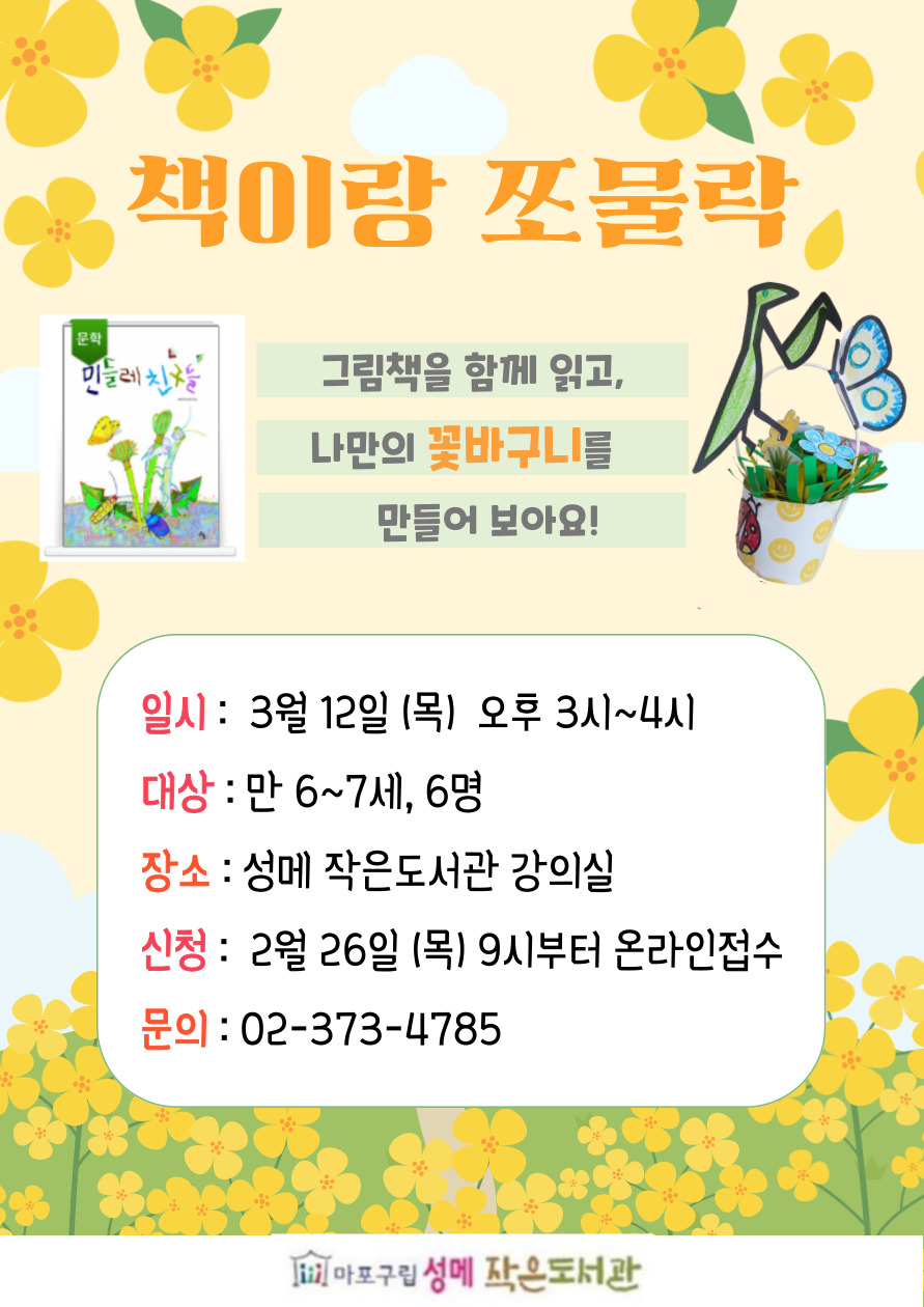 | 프로그램명 | [성메] 책이랑 쪼물락 : 나만의 꽃바구니 만들기 접수중 | ||