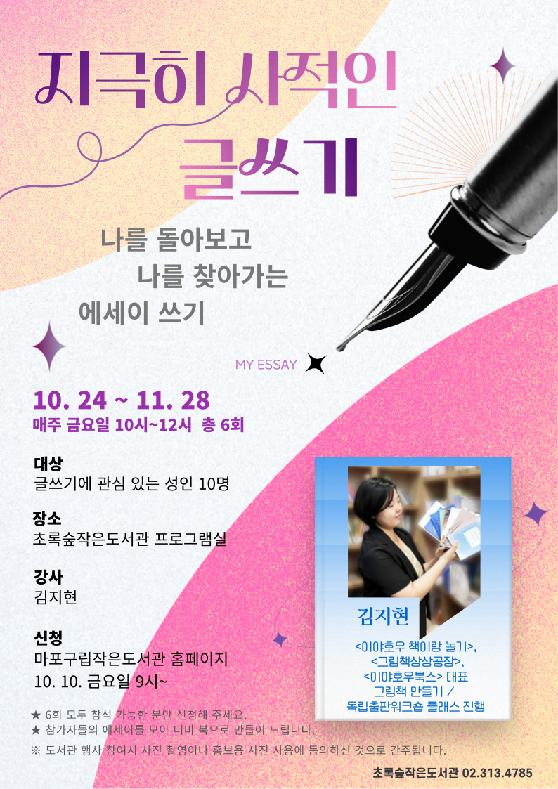 [초록숲] 지극히 사적인 글쓰기 나를 돌아보고 나를 찾아가는 에세이 쓰기 일시 : 10. 24. ~ 11. 28. / 매주 금 / 총 6회 / 10시~12시 대상 : 글쓰기에 관심 있는 성인 10명 장소 : 초록숲작은도서관 프로그램실 강사 : 김지현 방법 : 마포구립작은도서관 홈페이지 신청 : 10. 10. (금) 09시~ ★ 6회 모두 참석 가능한 분만 신청해 주세요. ★도서관 행사 참여시 사진 촬영이나 홍보용 사진 사용에 동의하신 것으로 간주됩니다. 문의 : 초록숲작은도서관 02-313-4785 |