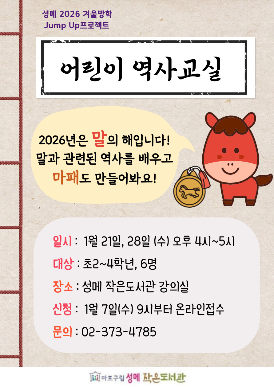 | 프로그램명 | [성메] (방학특집) 어린이 역사교실 마감 | ||