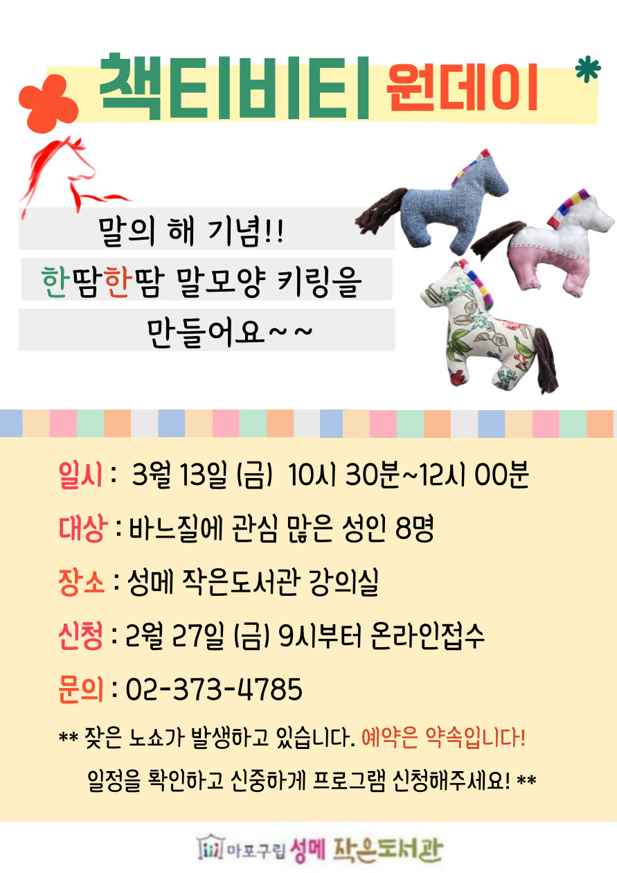 | 프로그램명 | [성메] (성인) 책티비티 원데이 - 바느질로 말키링 만들기 마감 | ||