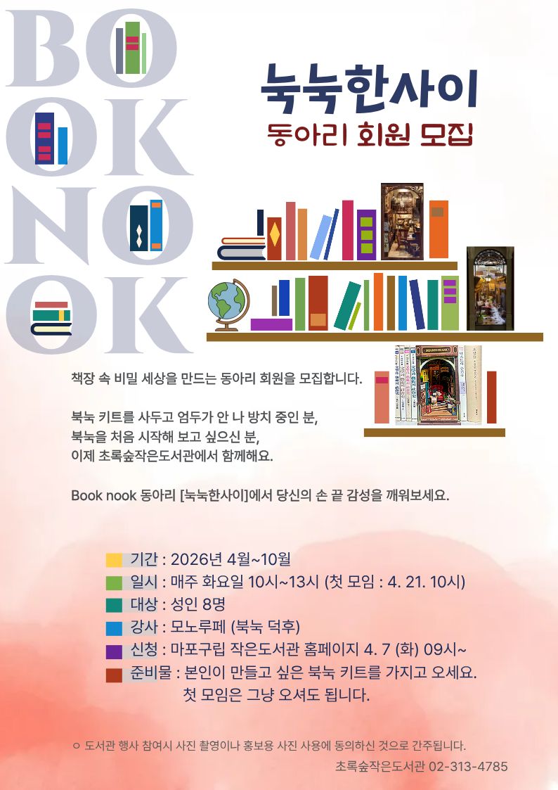 Book nook 동아리 [눅눅한사이]에서 당신의 손 끝 감성을 깨워보세요. 기간 : 2026년 4월~10월 일시 : 매주 화요일 10시~13시 (첫 모임 : 4.21 10시) 대상 : 성인 8명 강사 : 모노루페 (북눅 덕후) 신청 : 마포구립 작은도서관 홈페이지 4.7(화) 09시~ 준비물 : 본인이 만들고 싶은 북눅 키트를 가지고 오세요. 첫 모임은 그냥 오셔도 됩니다.