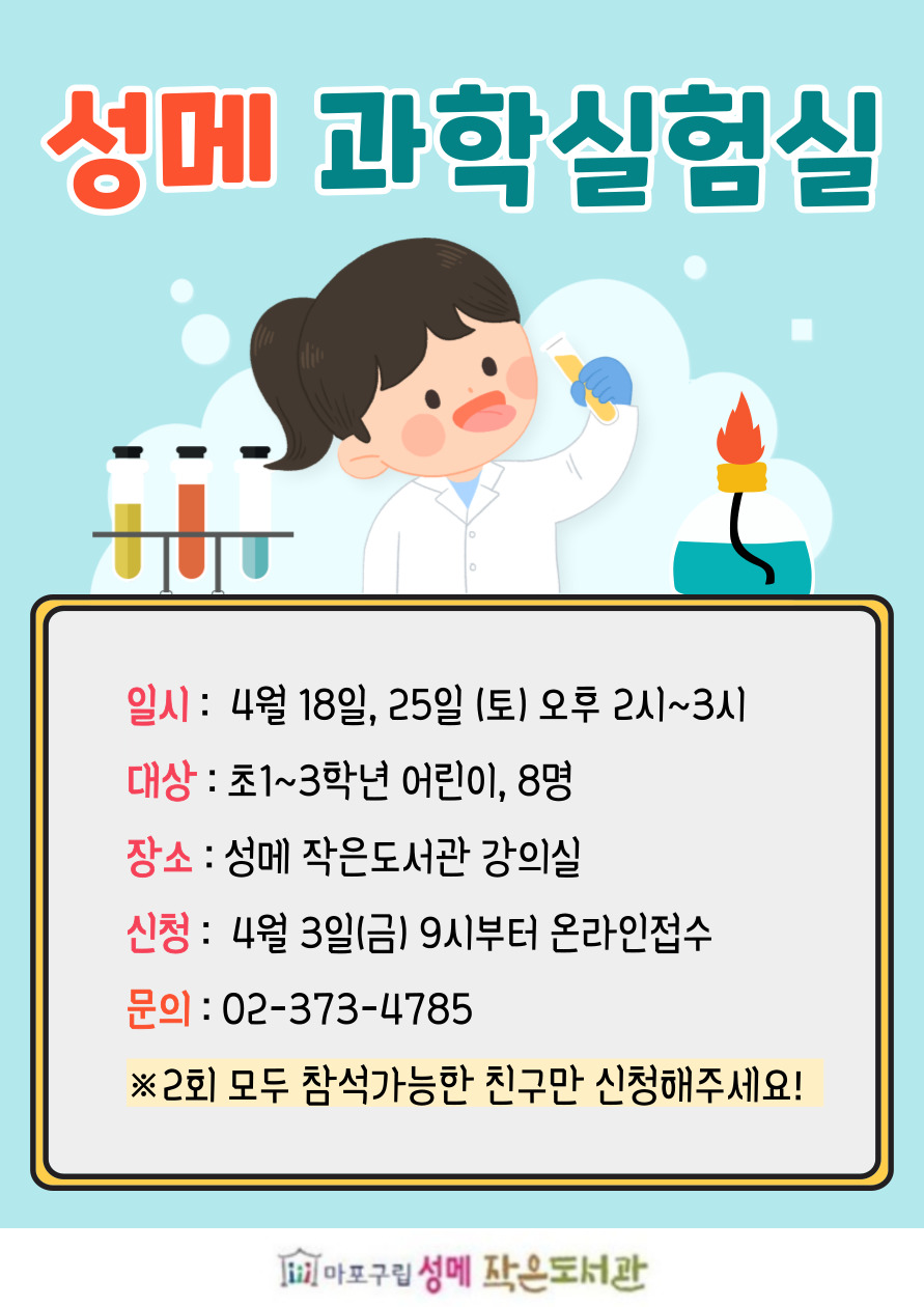 | 프로그램명 | [성메] 성메 과학실험실 (4월) 마감 | ||