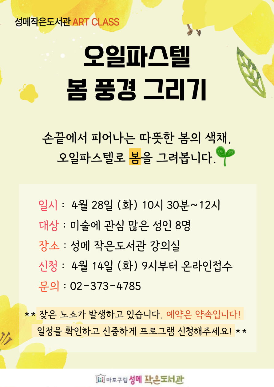 | 프로그램명 | [성메] (성인) 오일파스텔 봄 풍경 그리기 접수중 | ||