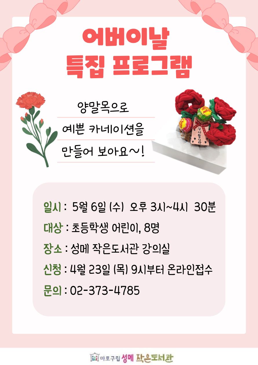 | 프로그램명 | [성메] (어린이) 어버이날 특집 - 양말목으로 카네이션 만들기 대기자접수중 | ||
