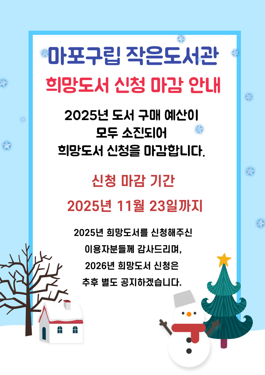 | 제목 | 2025년 마포구립 작은도서관 희망도서 신청 마감 안내 |