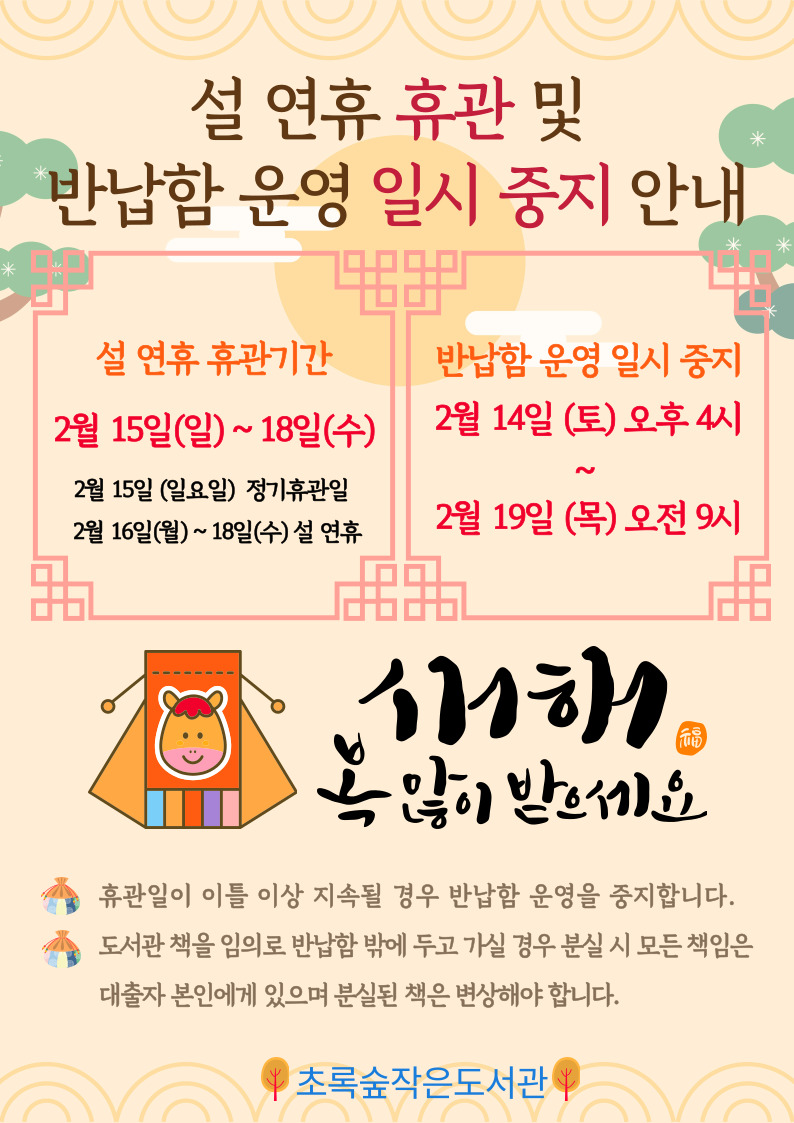 | 제목 | [초록숲] 2026년 설 연휴 휴관 및 반납함 운영 일시 중지 안내 |