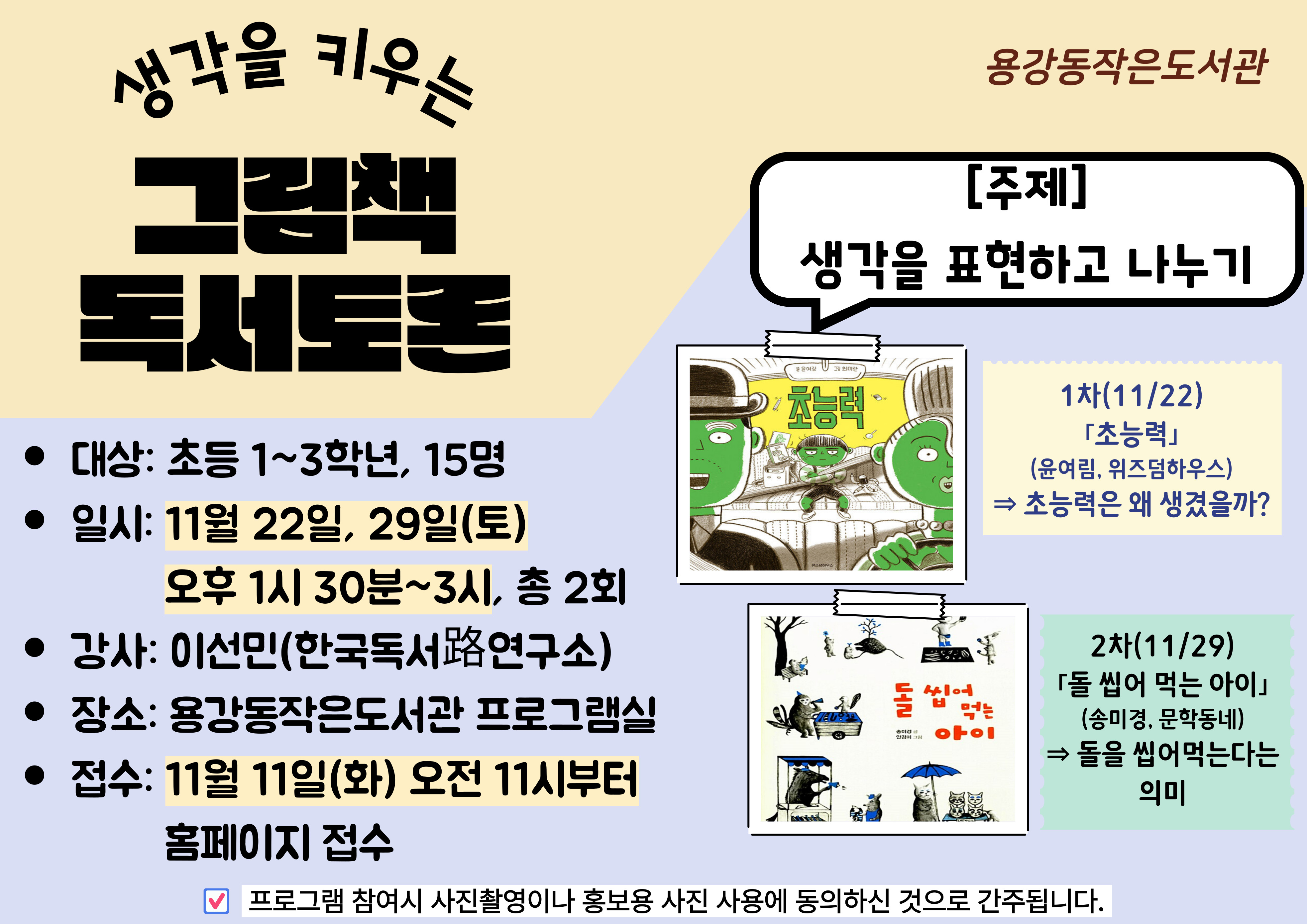 * 대상 : 초등 1~3학년, 15명 * 일시 : 11/22, 11/29(토) 오후 1시30분 ~ 3시, 총 2회 * 강사 : 이선민(한국독서路연구소) * 장소 : 용강동작은도서관프로그램실 * 접수 : 11월11(화) 오전 11시부터 홈페이지 접수 용강동작은도서관 |