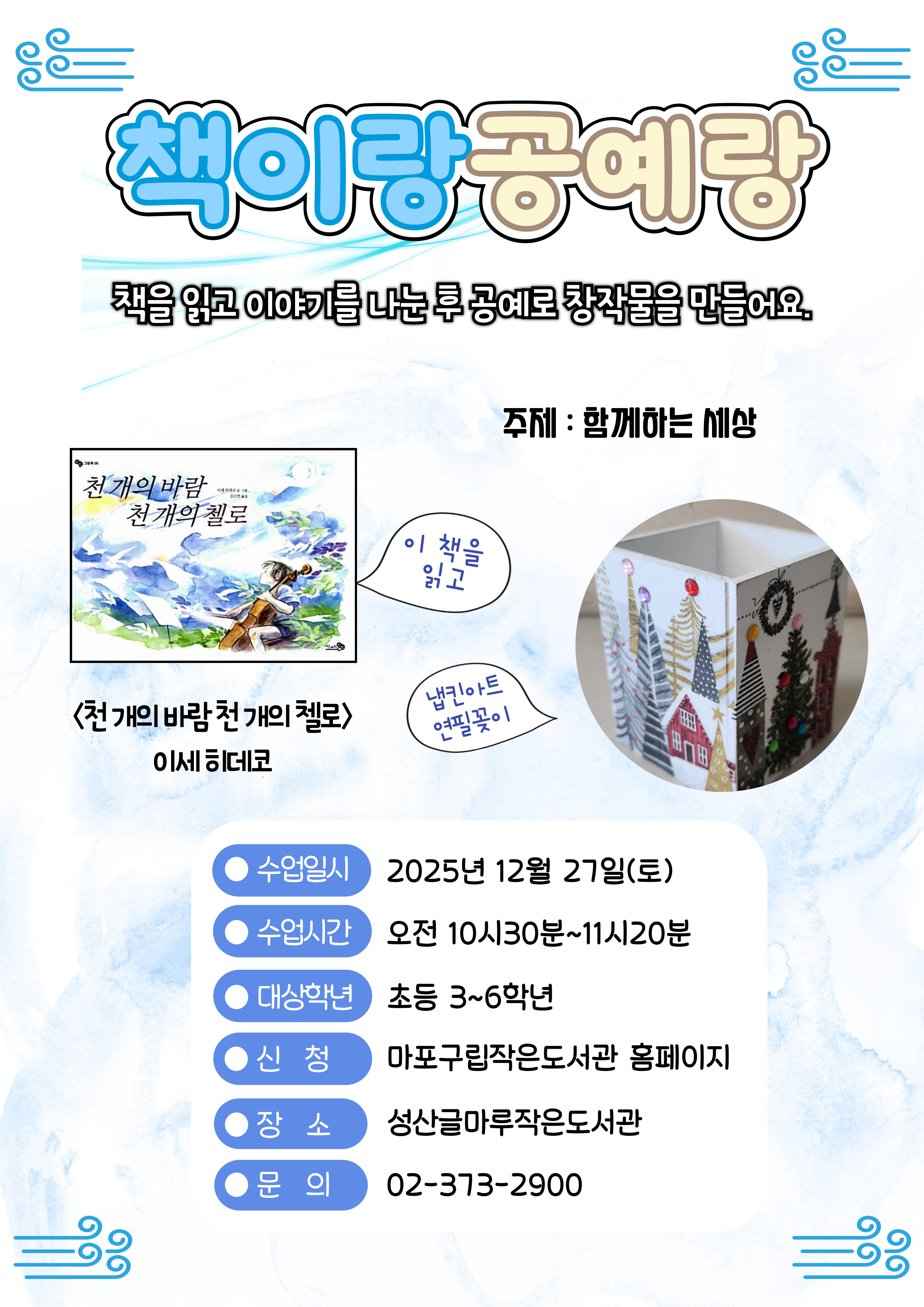 수업 일시: 2025년 12월 27일(토) 수업 시간: 10:30~11:20 대상 학년: 초등3~6학년 신청: 마포구립작은도서관 홈페이지 장소: 글마루작은도서관 교육실 문의: 02-373-2900 |