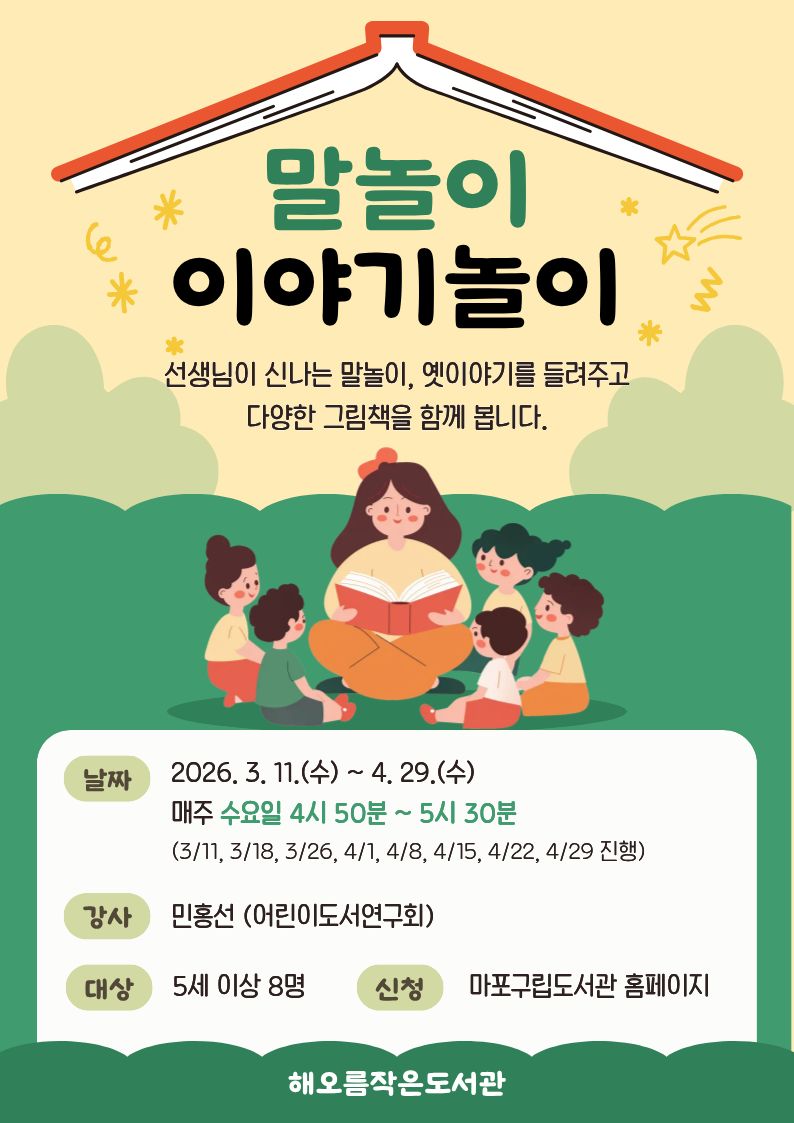 일시 : 3월 11일~ 4월 29일 매주 수요일 4시 50분~5시 30분 (3/11, 3/18, 3/25, 4/1, 4/8, 4/15, 4/22, 4/29 진행) 강사 : 민홍선(어린이도서연구회)