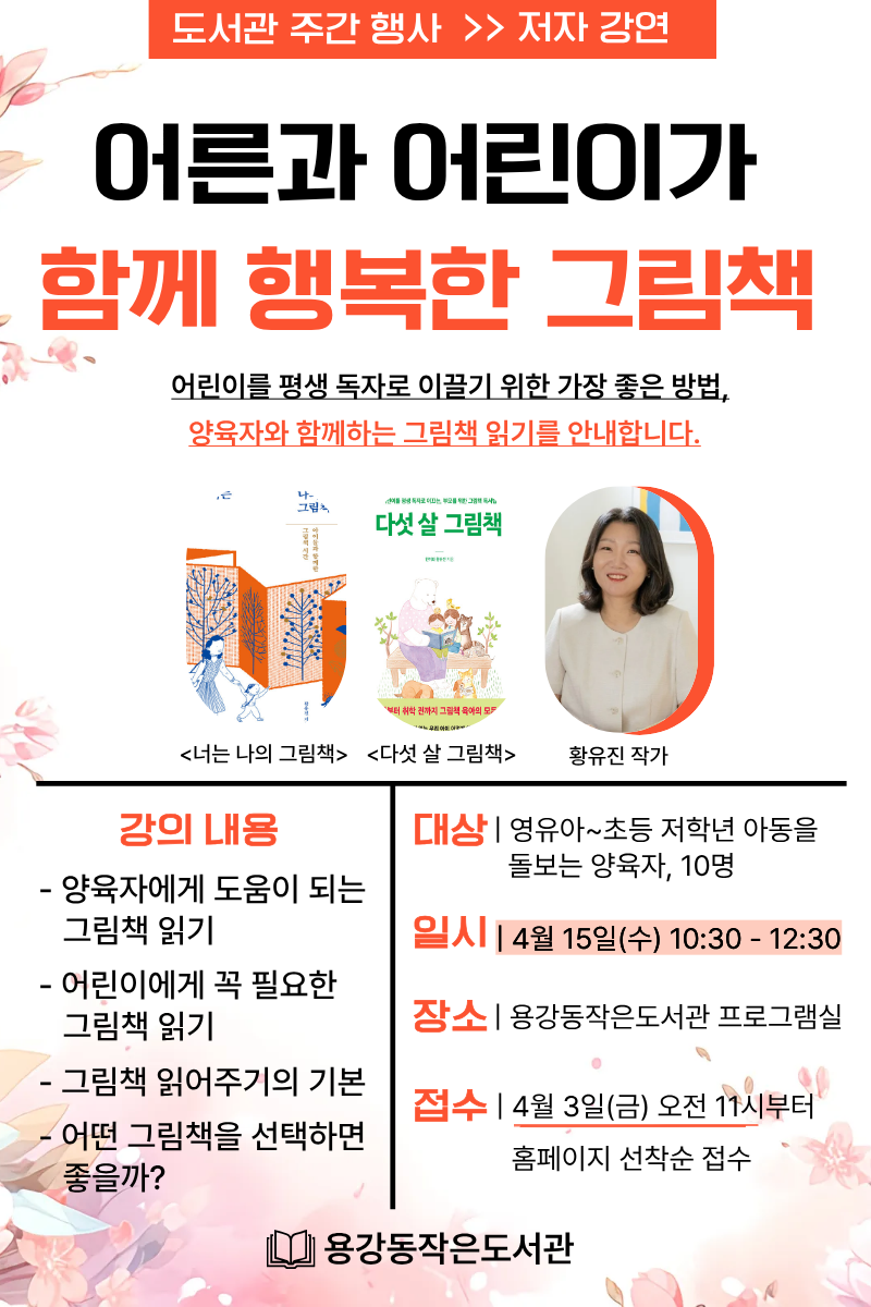 (도서관주간 행사 >>저자강연) 어른과 어린이가 함께 행복한 그림책 어린이를 평생 독자를 이끌기 위한 가장 좋은 방법, 양육자와 함께하는 그림책 읽기를 안내합니다. # 강의 내용 - 양육자에게 도움이 되는 그림책 읽기 - 어린이에게 꼭 필요한 그림책 읽기 - 그림책 읽어주기의 기본 - 어떤 그림책을 선택하면 좋을까? * 대상 : 영유아~초등 저학년 아동을 돌보는 양육자, 10명 * 일시 : 4월15일(수) 10:30~12:30분 * 장소 : 용강동작은도서관 프로그램실 * 접수 : 4월3일 (금) 오전 11시부터 홈페이지 선착순 접수
