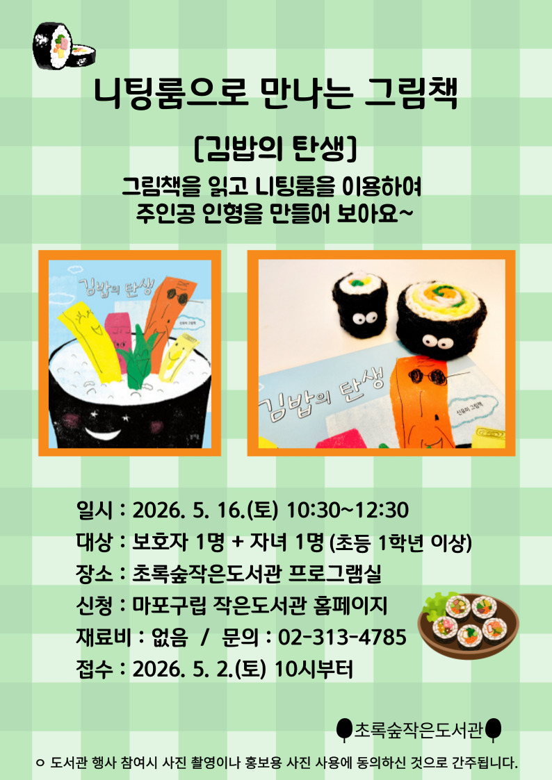 <5월> 니팅룸으로 만나는 그림책 일시 : 2026. 5. 16. (토) 10:30~12:30 초록숲작은도서관 도서관 행사 참여시 사진 촬영이나 홍보용 사진에 동의하신 것으로 간주됩니다. |