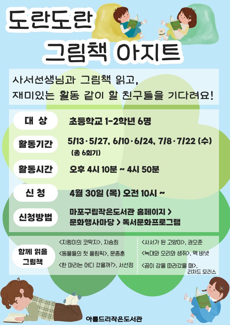 대상 : 초등학교 1-2학년 6명 활동 기간 : 5/13·5/27, 6/10· 6/24, 7/8·7/22 (수) 총 6회기 활동 시간 : 오후 4시 10분 ~ 오후 4시 50분 신청 : 4월 30일 (목) 오전 10시 ~ 신청 방법 : 마포구립작은도서관 홈페이지 > 문화행사마당 > 독서·문화프로그램