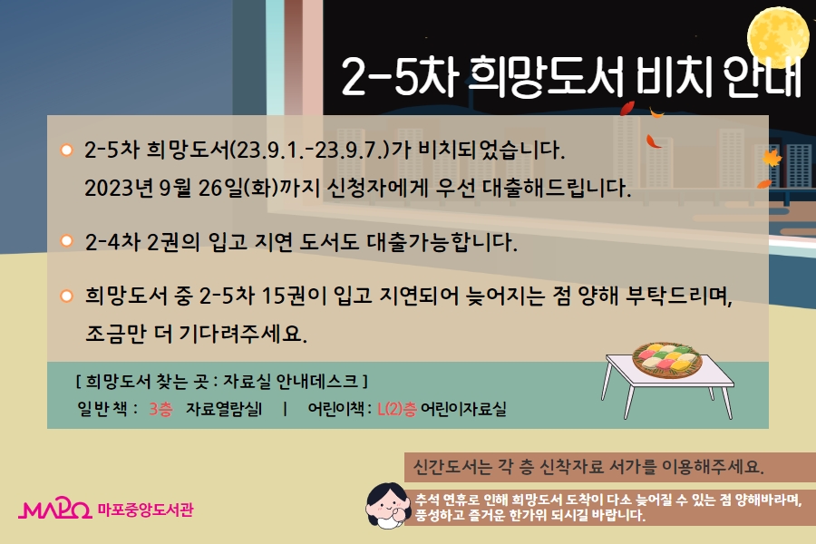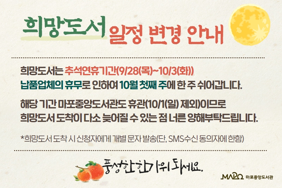 ◎ 희망도서는 추석연휴기간[9/28(목)~10/3(화)] 납품업체의 휴무로 인하여 10월 첫째 주에 한 주 쉬어갑니다. 희망도서 도착이 신청일에 비해 늦어지는 점 너른 양해부탁드리며, 풍성하고 즐거운 한가위 되시길 바랍니다.