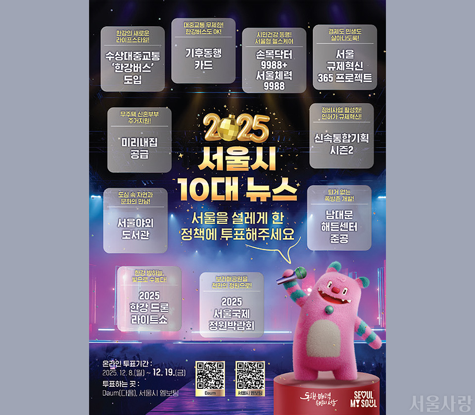 2025년 한 해 동안 추진된 서울시 주요 정책 가운데 시민 여러분의 공감을 가장 많이 받은 이슈를 선정하는 「2025 서울시 10대 뉴스」 온라인 투표가 진행됩니다.
